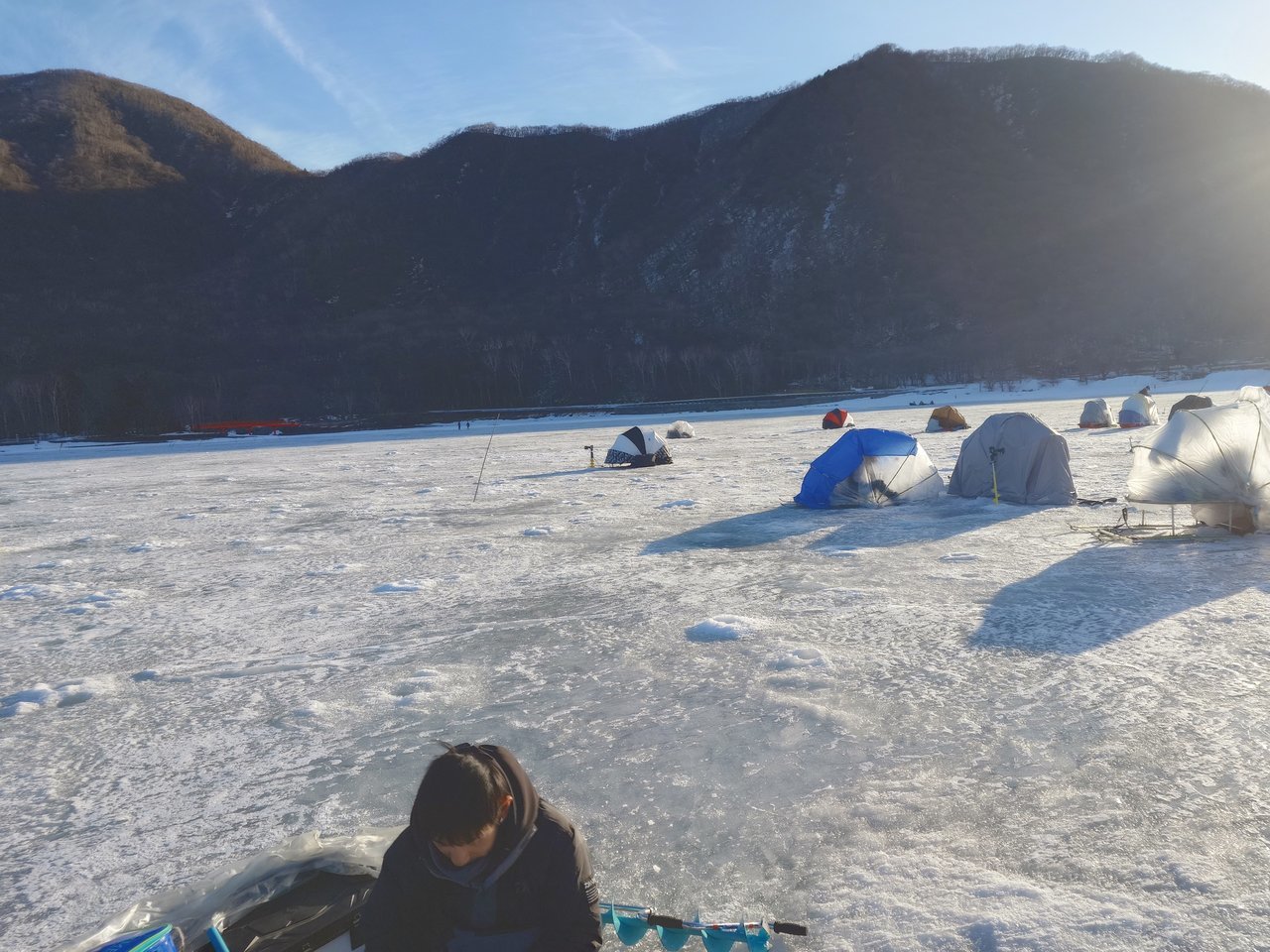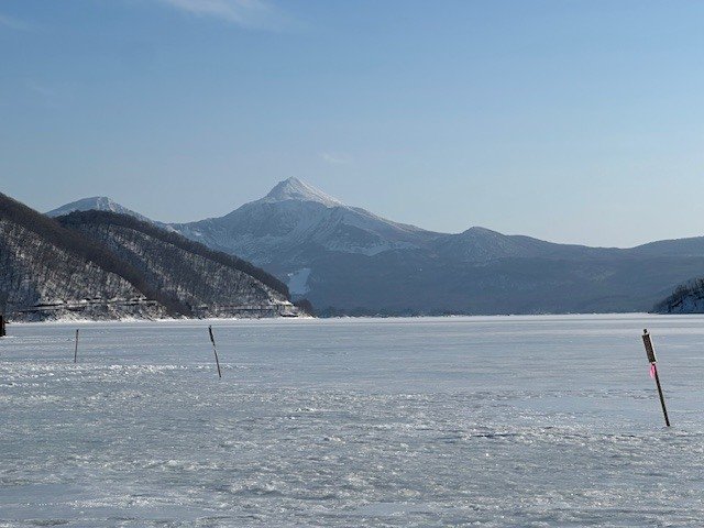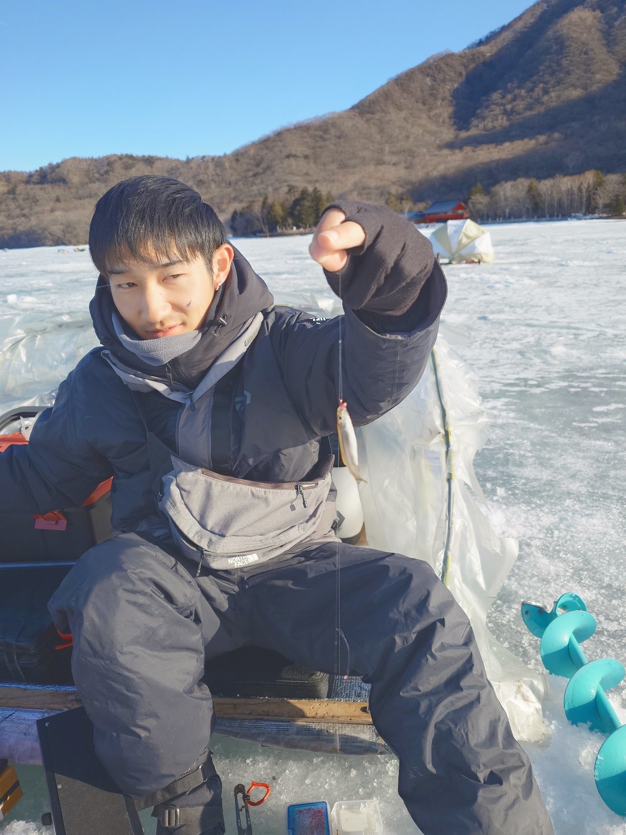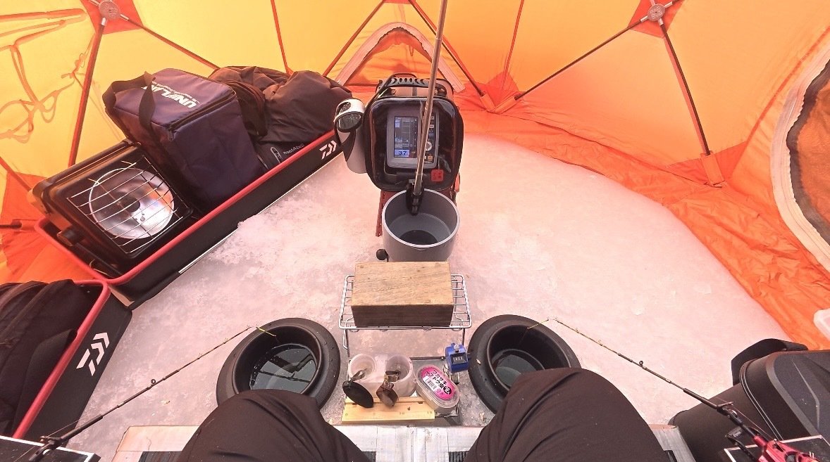 以前より赤城大沼へ氷上ワカサギ機会があればと思っていたところ中村さんよりワカサギのお誘いのがあり、例年にない好釣果が続いている赤城大沼へ行くことが出来ました。赤城大沼の青木別館さんに前々日にテント、ドリルの予約を入れました。当日6:30より受付開始で6時頃到着、車中で少し仮眠し受付後テント、ドリルの他日釣り券と青木別館SP竿仕掛けセットレンタルを払いいざ定刻7:00に氷上へ。防寒対策はしたつもりでしたが顔周りがどうしても冷たい。今後の課題にしてポイント「リンク脇」へ。アイスドリルに電動ドリル、アダプターをセットしてホリホリ。3箇所空けて一番最初に開けた穴が反応良かったのでそこで釣り始める事にしました。天気も良く途中テントを閉めておくと暑くなり途中で露天の釣りにしました。自分は手繰りだったので不具合は無かったのですが、中村社員は電動でやっていた為ガイドが氷付くトラブルが。手繰りはあたりがあって合わせるもイマイチ乗りが悪く釣果伸びません。釣り座周りも何か位置関係が悪く思考錯誤しながら終了しました。レンタル品を返却するときに色々お話を伺うと「誘ってひっかけて乗ったら手繰る」そうで全然わからなかったので次回よりこれを参考に課題を克服しリベンジしたいと思います。赤城大沼のワカサギにどっぷりハマりました。カタツムリテント手配済み!!