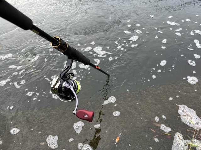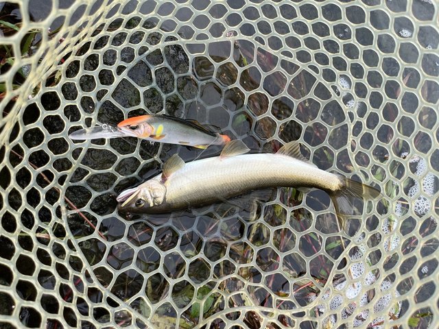 鮎が溜まっていたポイントの少し上にエントリーし、まずはキャストして探りますが無反応。次に護岸に上がってポイントベタベタに陣取りしゃがんでルアーを送り込むと時折アタックしてくるのが見えますが掛からず。もう少し潜らせた方が良さそうだったのですがオモリを忘れる痛恨のミス、、、と思いきや普段バス釣りで使っているバッグを漁るとダウンショットシンカーを発見!スナップで無理やり付けて投入、からの2連発!!