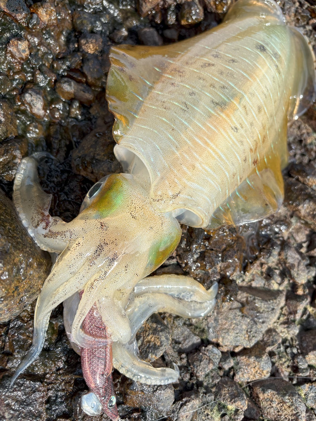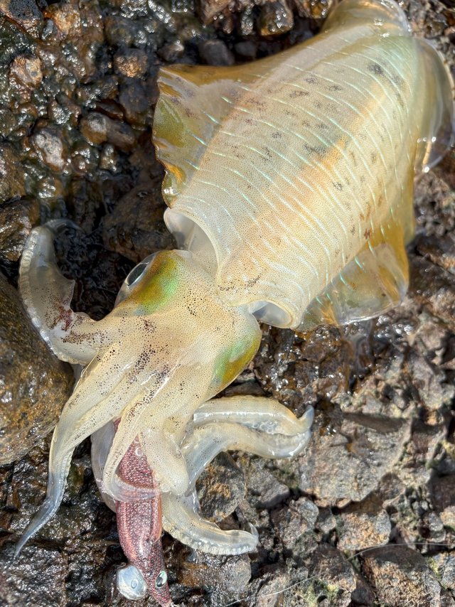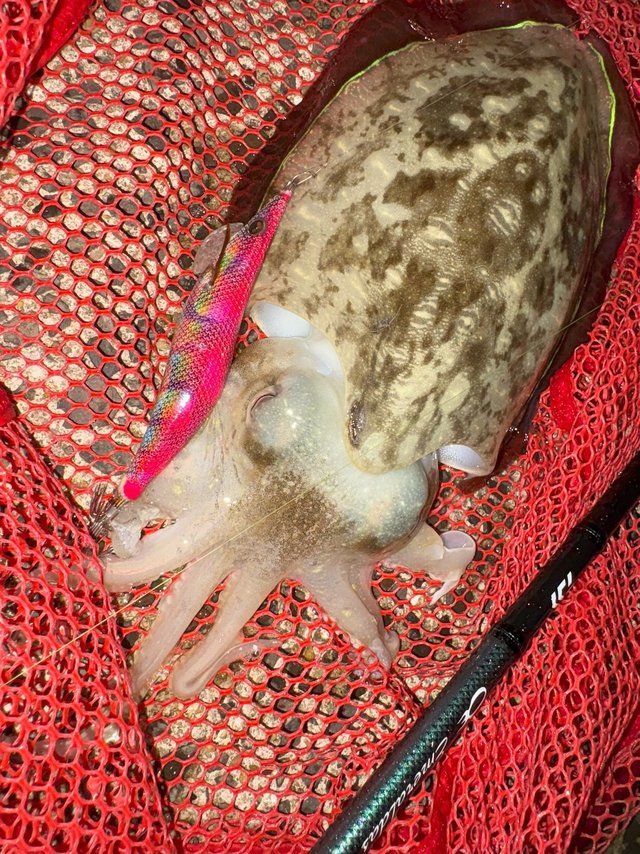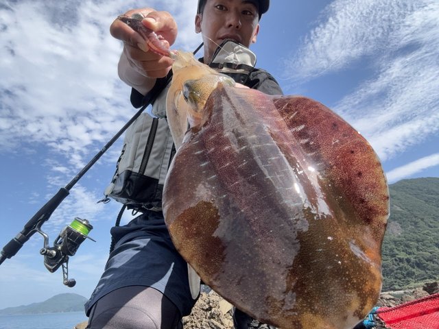 こんにちは!スタッフ佐久間です!平戸にエギング調査に行って来ました!朝マズメ1時間前から漁港にエントリー。まずはエギ王LIVEサーチで探るも反応なし。次はエギ王LIVEのオールマイティーなマーブルカラーで探ると、、足元のステイでドンっ!キタっ!コウイカちゃん!その後はアタリは無く。日が昇って来たかな?というタイミングで雷&豪雨。たまらず避難。午後まで止みそうにないので車で仮眠zzz。起きたらめっちゃ晴れてるやん!漁港続きの地磯へ。30mくらい沖まで水深1.5mくらいのシャローエリアでランガン!30分程釣り歩き、海面から見ると黒くなっているエリアの際を通すと、むにっ、とした感触が!半信半疑で合わせると、、グンっ!ジィっー!500gのアオリイカちゃん。その後も30分程釣り歩きましたが反応は無く。風が吹き出し、また雨が降り出したので納竿となりました。実釣時間は少ないですが、満足の釣行でした!