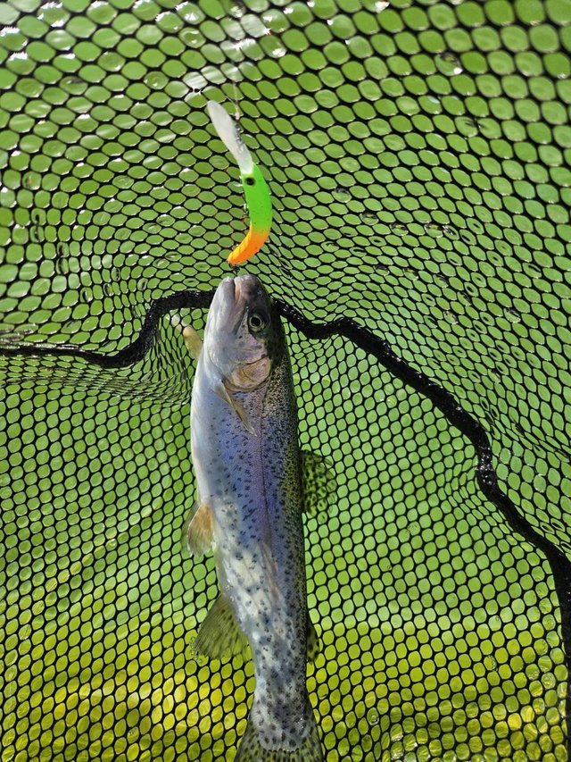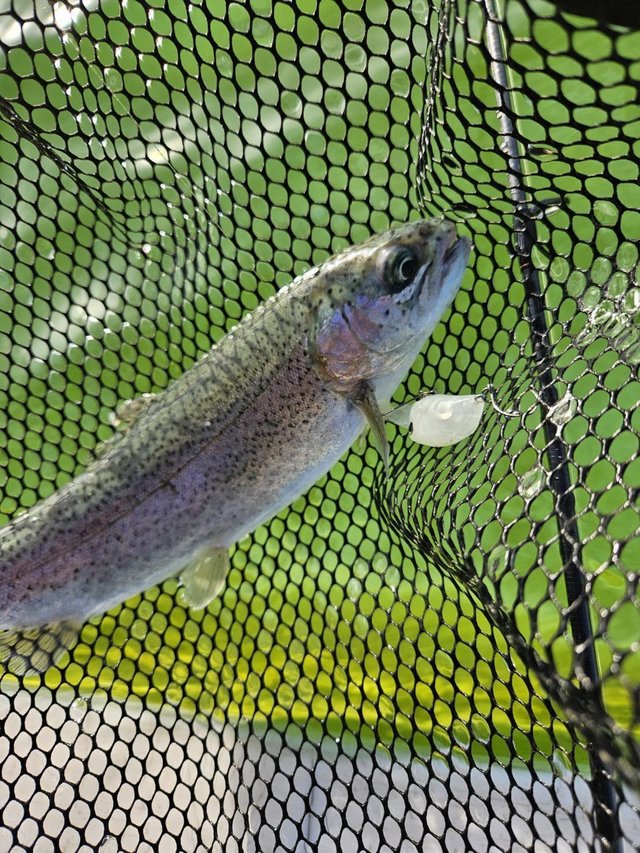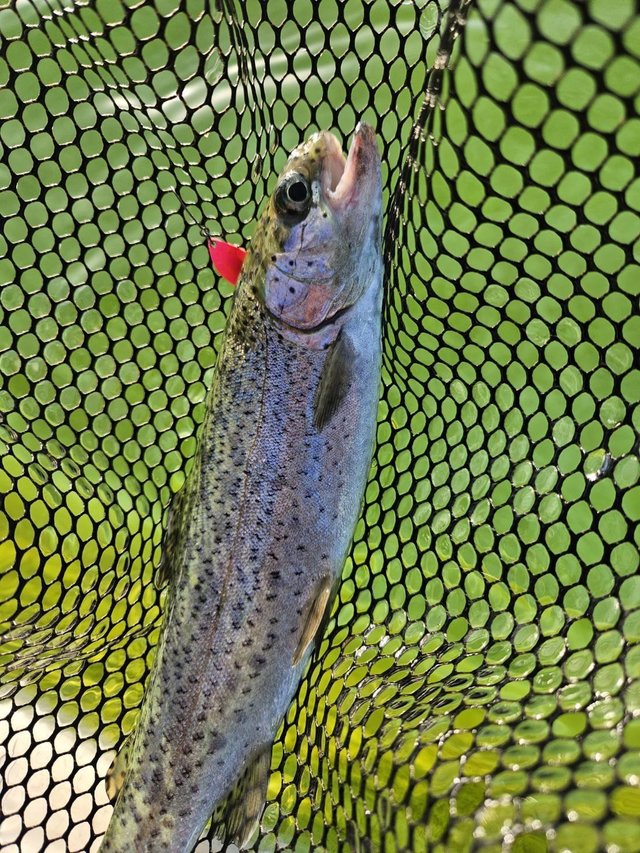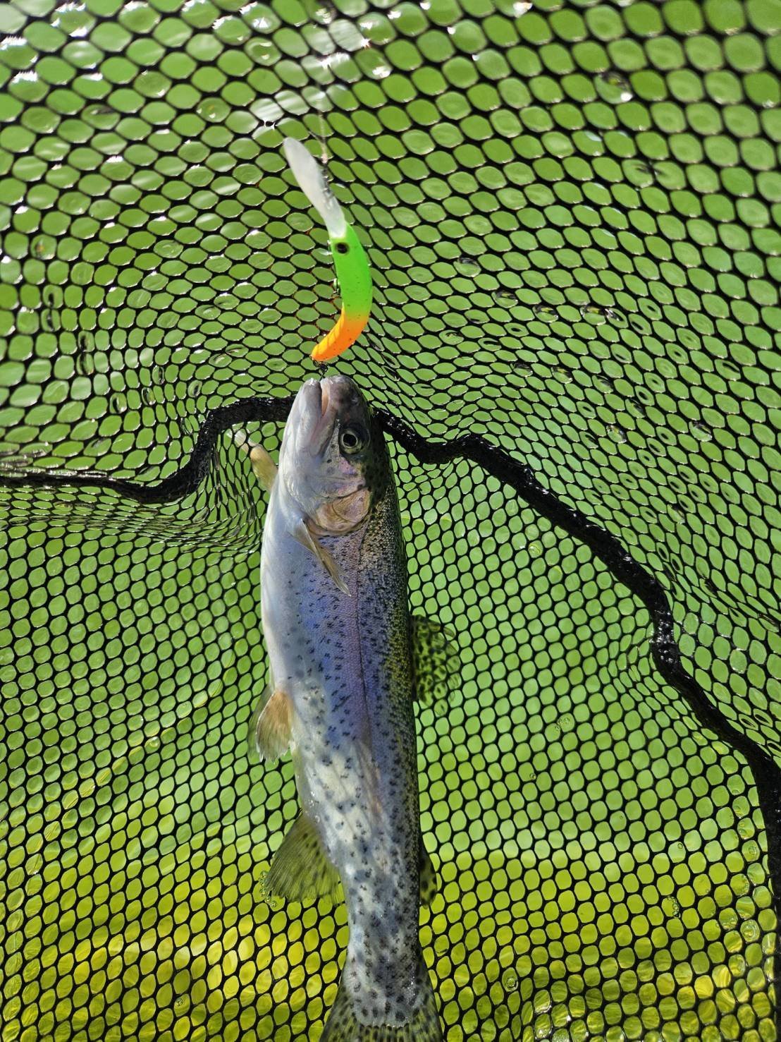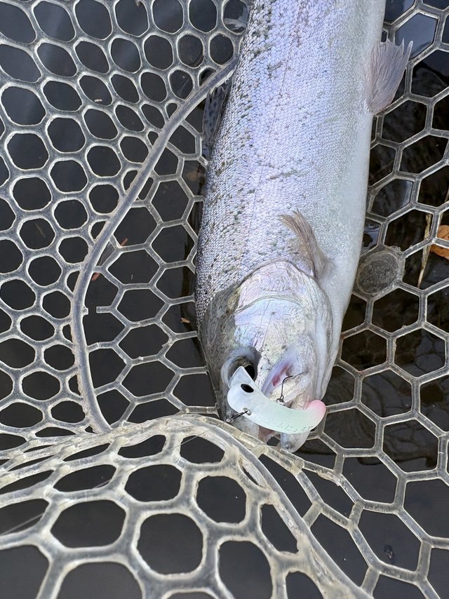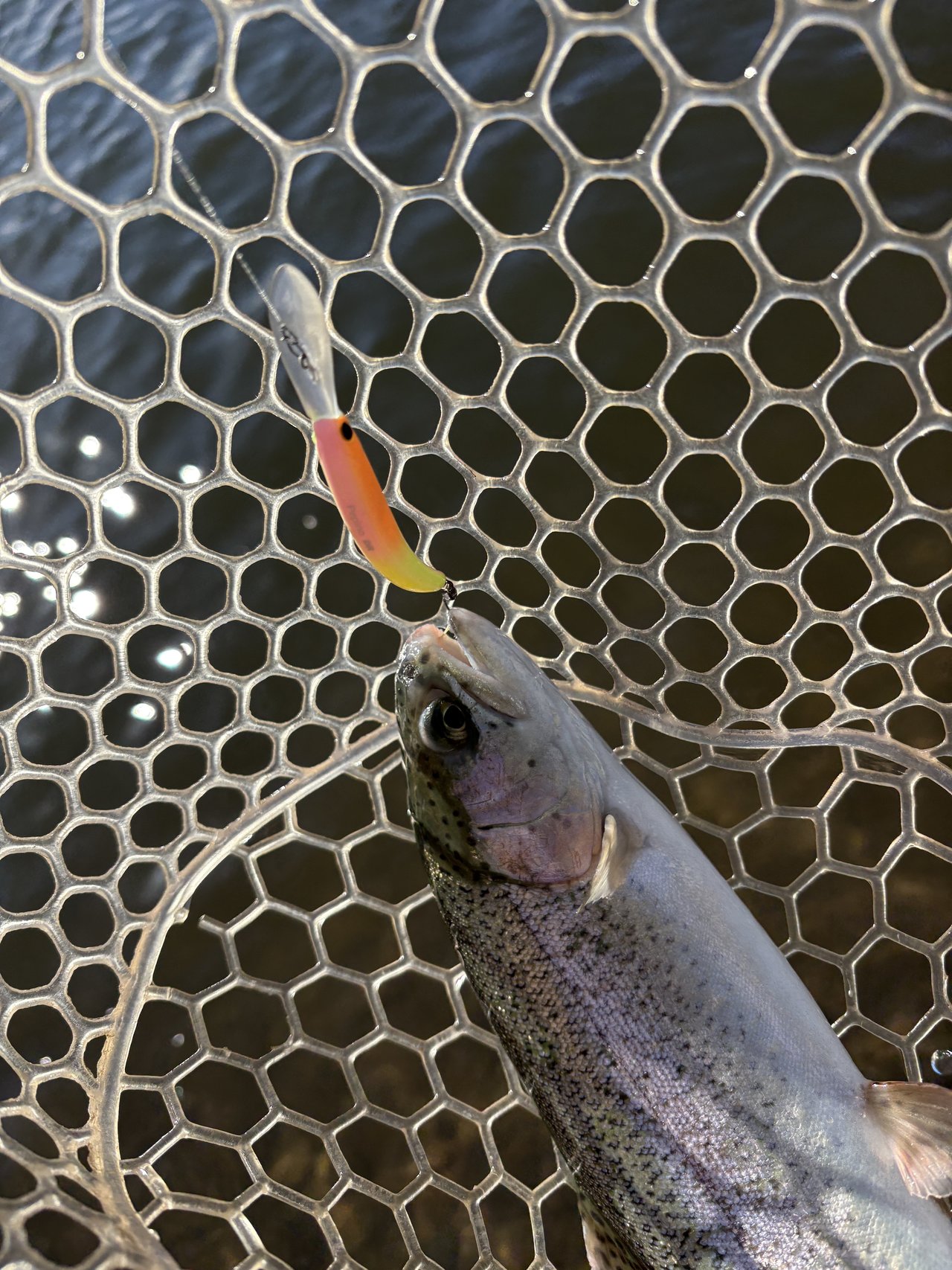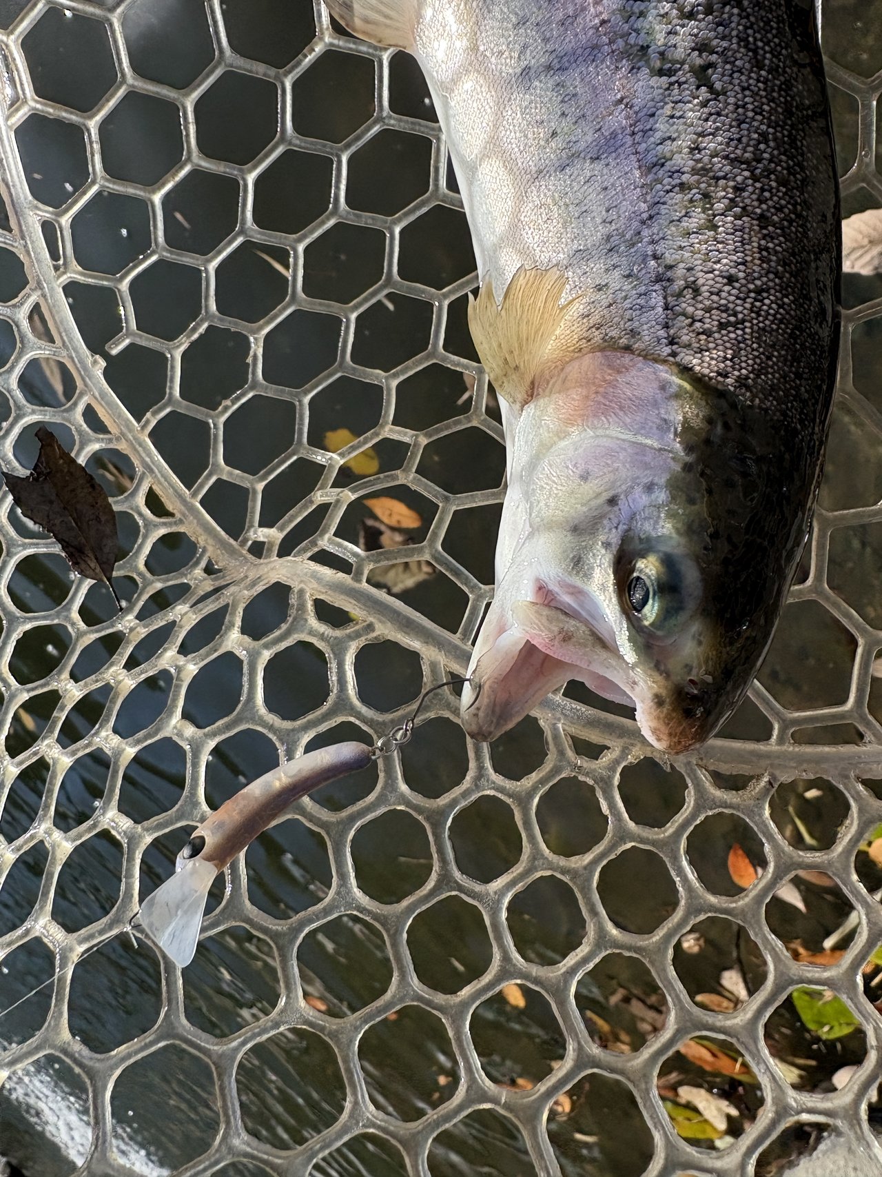 最後にトラウトエリアに行きましたが強風の為落ち葉が多く浮いていた為中々スプーンを引くのは困難そうでしたが1投目で釣れました。