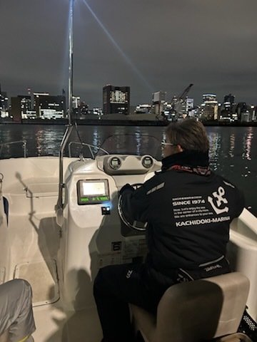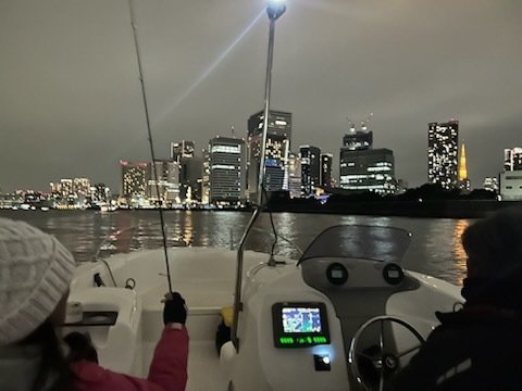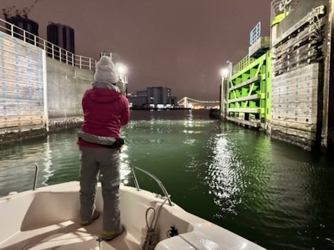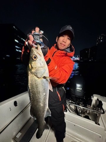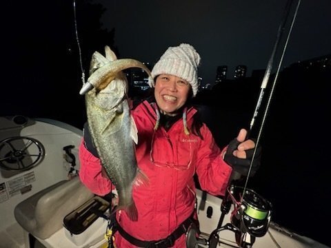 出船して2~3分でポイントにつきました。最初は船長が教えてくれてるポイントにルアーが届かなかったり、とんでもない方向に飛んでましたが、慣れてくるとだいぶ距離もでて、何とか1匹釣ることが出来ました。船長曰く、普段はもっとシーバスがボイルしたりアタリが出ているですけど…。でも私は目標は達成できましたし、夜景を見ながら釣りができたのですごく楽しかったです。あっという間の2時間でした。船長も、なか乗りのスタッフさんもとっても親切にしていただき、ほぼ初めての私でも気軽に乗船出来ました。時間も短いので初心者に最適なコースです。私はちょっと欲が出て、今度はプラグで釣りたいです。船長、ありがとうございました。