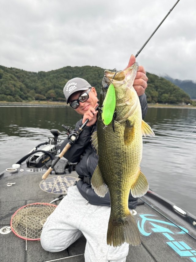 ラスト1時間は再びシャローでトップをやることに!すると今度は新間プロがアベンタクローラーで55cmをキャッチ!どシャローから引っ張り出した流石の1本!