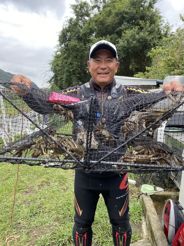 朝到着すると森川さんが笑顔でお待ちかね♪昨夜仕掛けたカニ網でたくさんのモクズガニを仕留めたらしく、「モクズ王と呼んでくださいっ!」と満面の笑みで大漁のカニ網を見せてくれましたっ笑笑