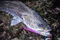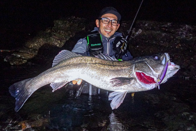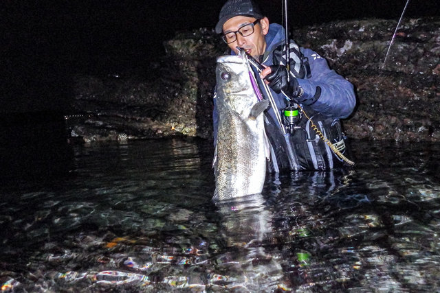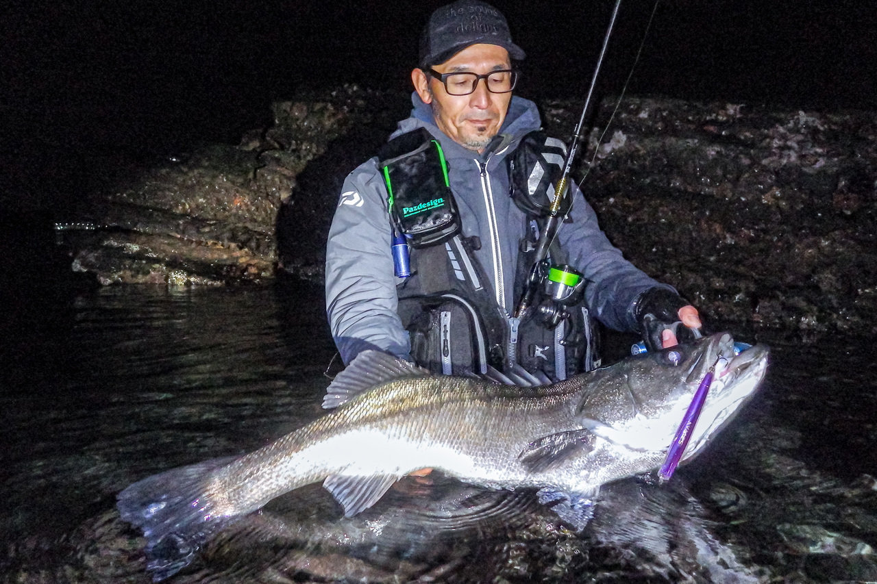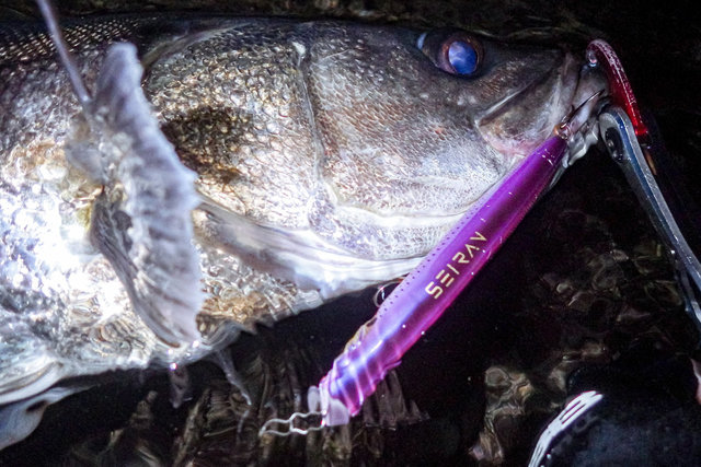 「ドンっ」重く鋭いアタリに巻く手が止まった。デカいのが近くで食った時特有のアレ。ゆっくり確実に距離を詰め、浅瀬の岩にズリ上げて、グリップを掛けた。