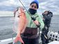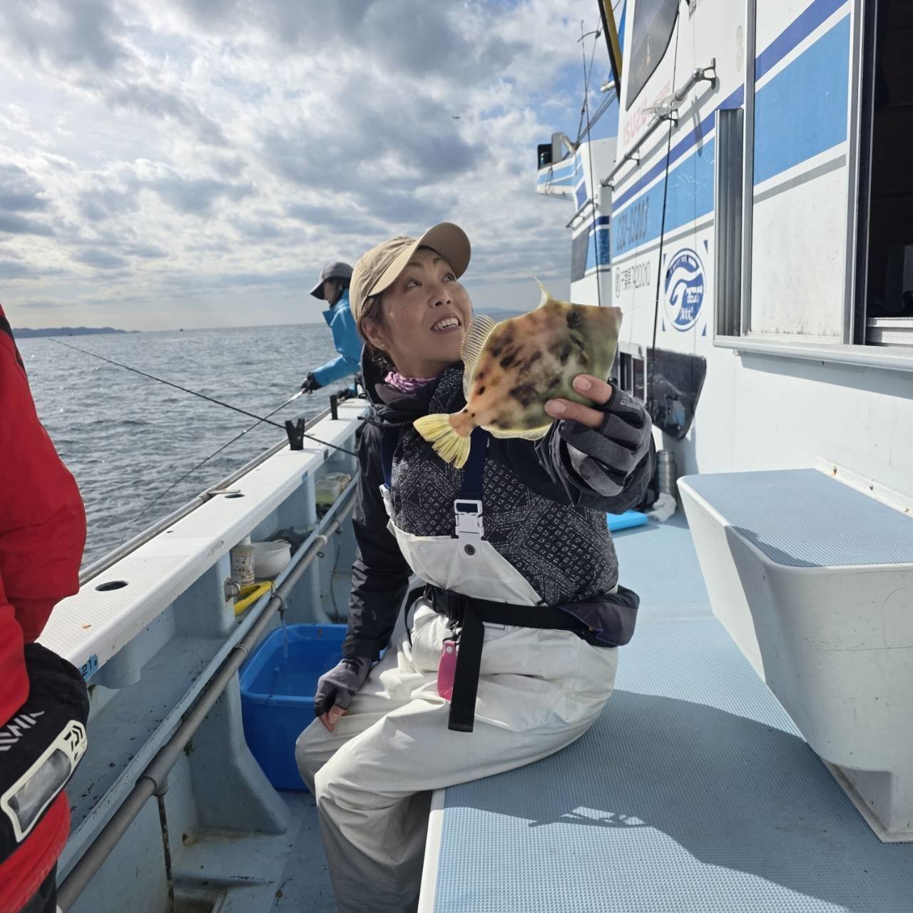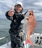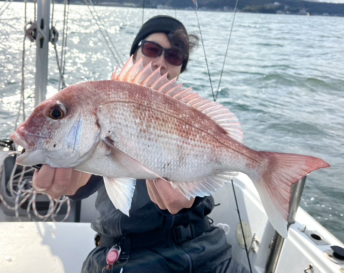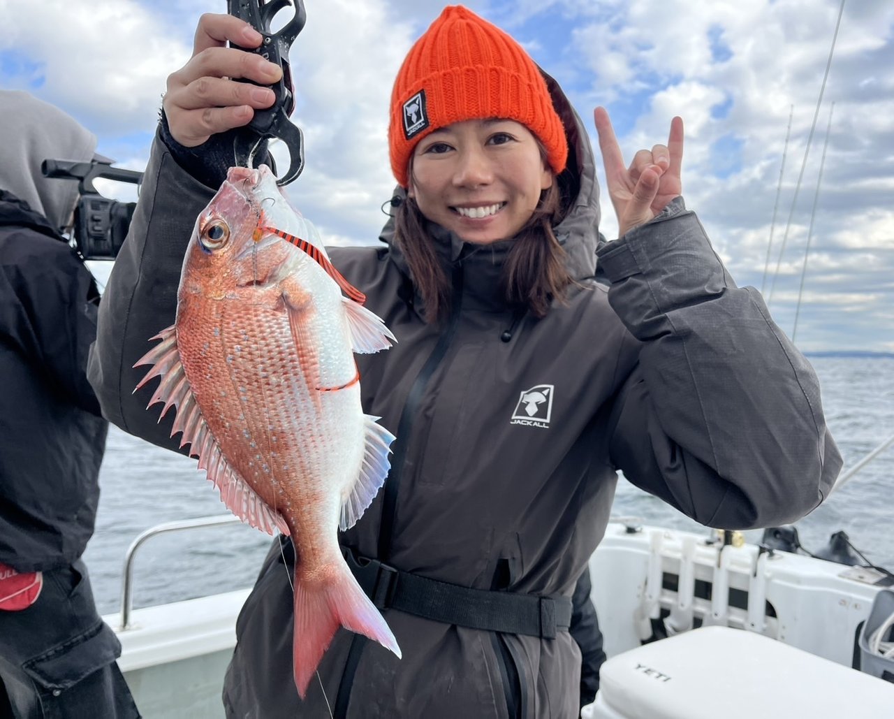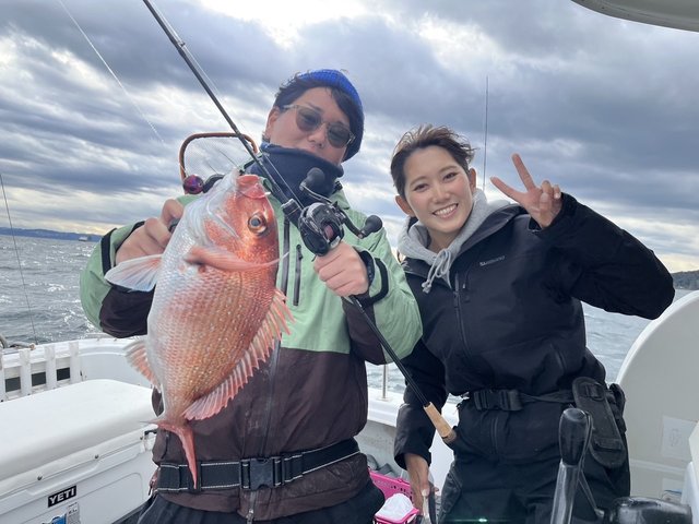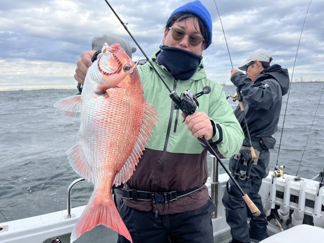 ポイントに着き開始早々アタリが!久々のタイラバなので慎重にGET!キロクラスの美味しそうなマダイに一安心♪流石の田邊プロ、早々のネクタイチェンジでリバーシブルクロキンでキャッチ!!濁りのある東京湾で強いご当地カラー的存在だそうです!常連様もポツポツ釣り上げ賑やかに!K姉さんもしっかりGETで良い笑顔♪