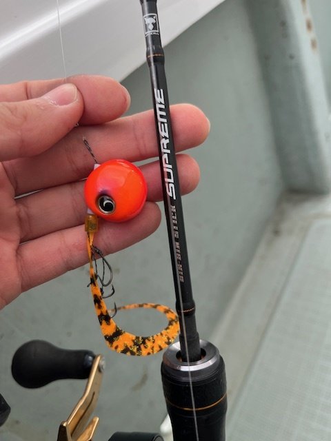 足立環七店中山です!!今回はジャッカルさんにお誘い頂き熱田さんと共に【なぶらフィッシング】さんへ。明石をホームにする田邊プロと同船です♪ジャッカルのシリーズ最高峰!シュプリーム510XSULをお借りして、TGヘッドにマスターカーリー、田邊さんイチオシのシマシマオレンジゴールドラメでスタート‼