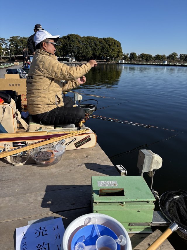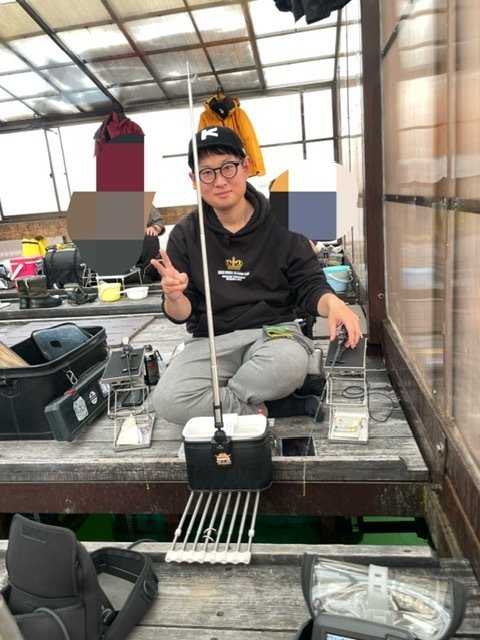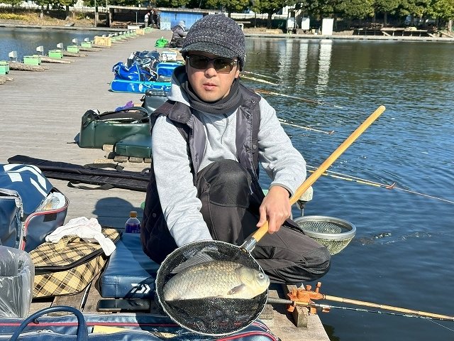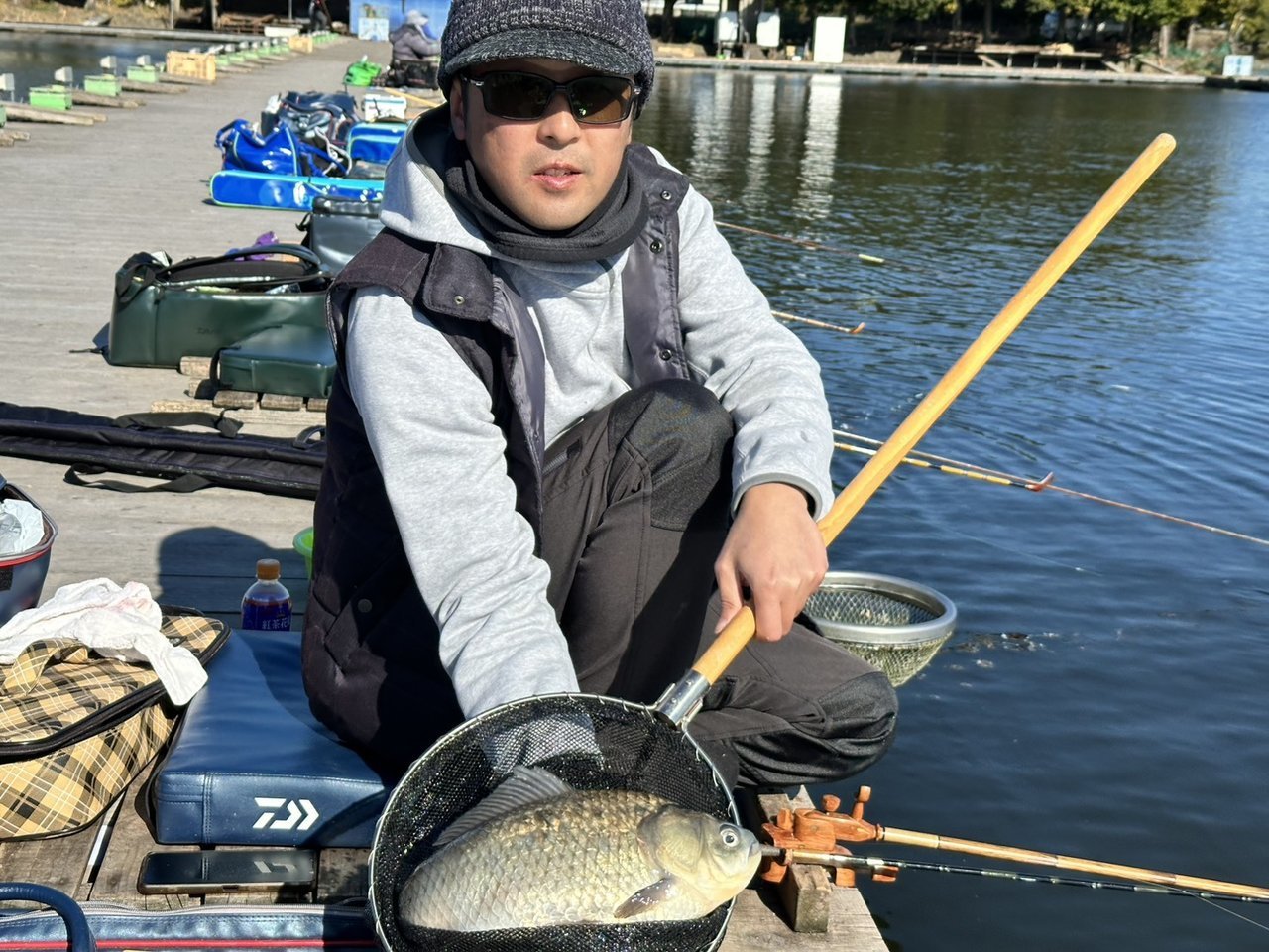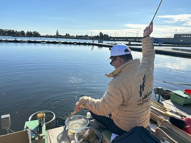 9時頃からは座学を踏まえて実釣開始、10:00頃までは冷え込みも厳しくなかなかウキも動きませんでしたが根気よくエサを打って行くとしっかり魚は寄って来てくれたので午前中はなんとか3枚釣る事が出来ました。