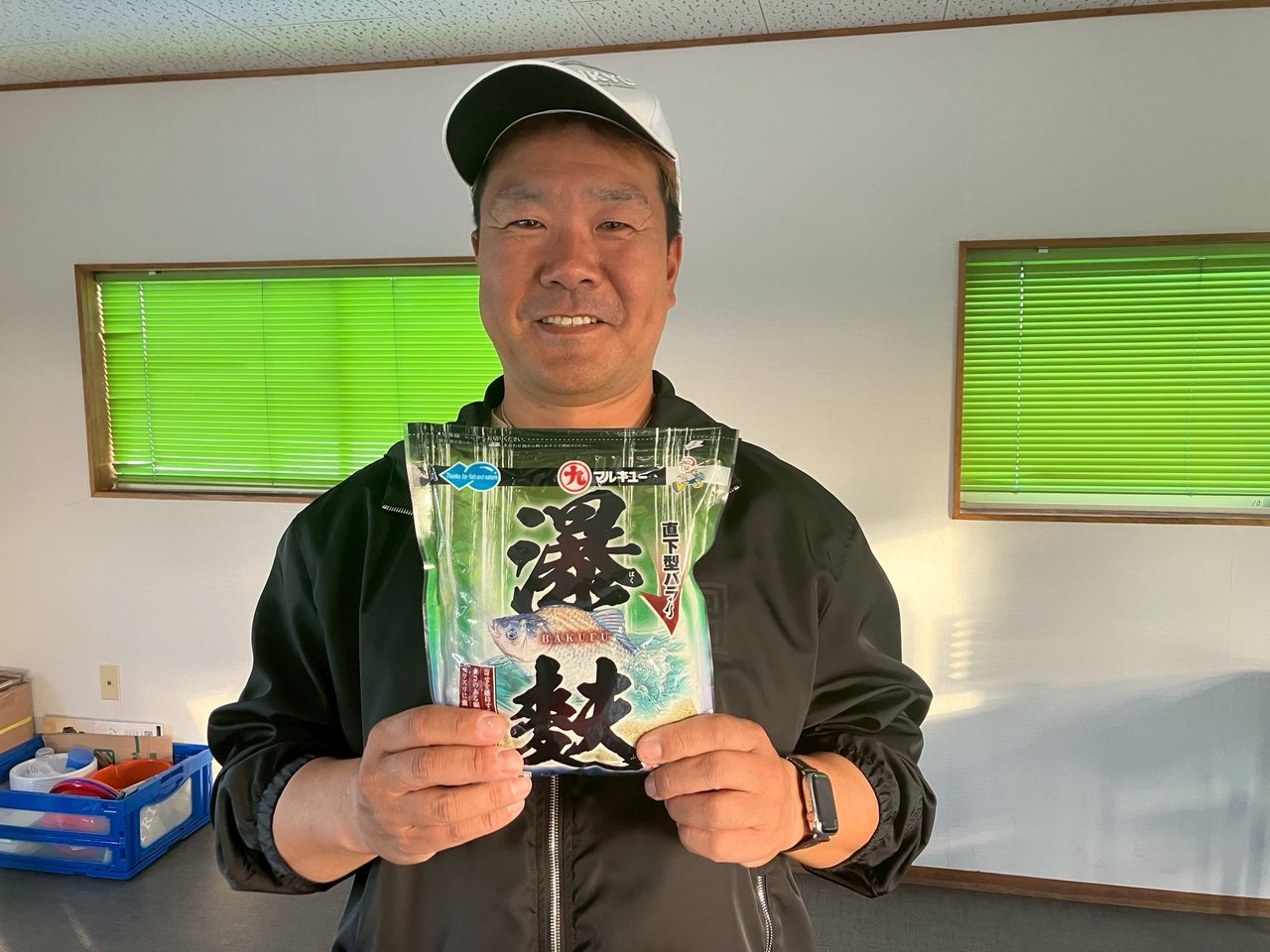 朝一は事務所をお借りしてマルキューインストラクターの杉本智也さんに瀑麩の特徴やオススメブレンド、うどんセット釣りの基本などを解説していただきました。