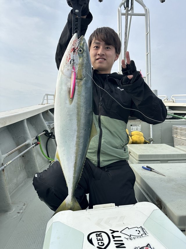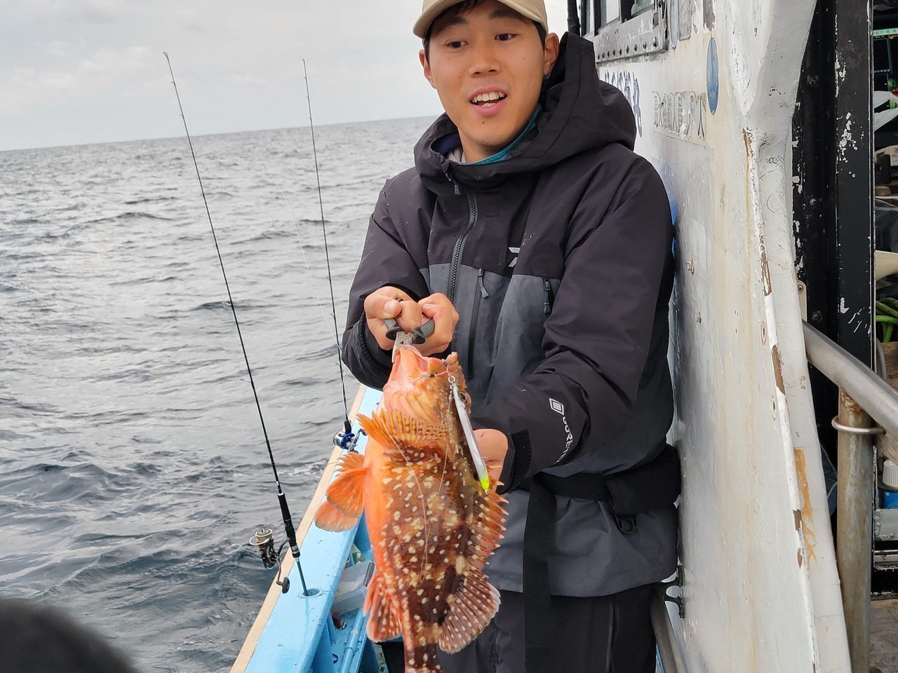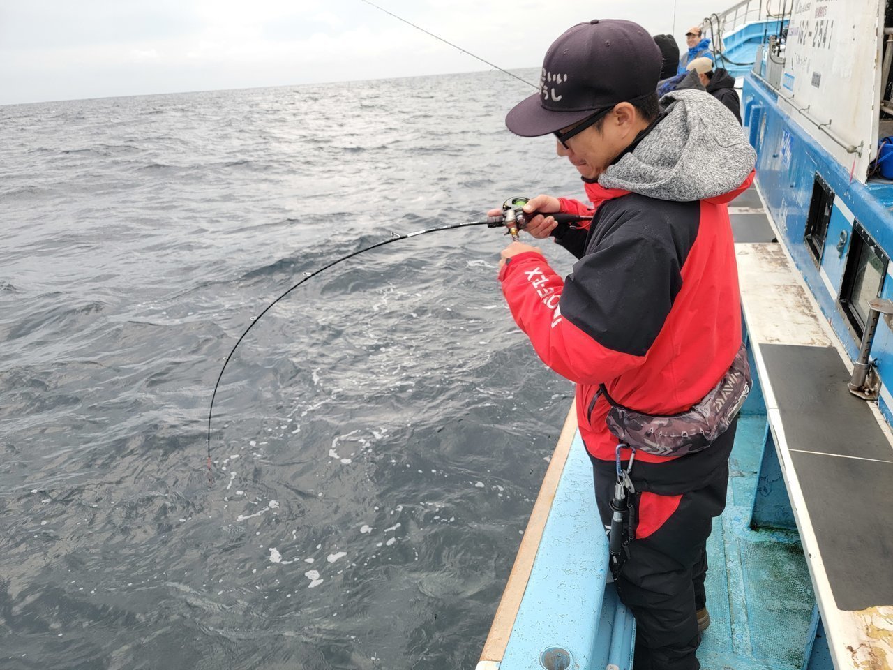 出航してしばらく船に揺られながらポイントへ到着、まずは浅場のポイントでしたので軽めのジグをチョイスしました。しばらく狙って反応がないか探りつつふとジギング初挑戦の岩瀬君の様子を見ると竿先に異常な動き…