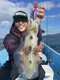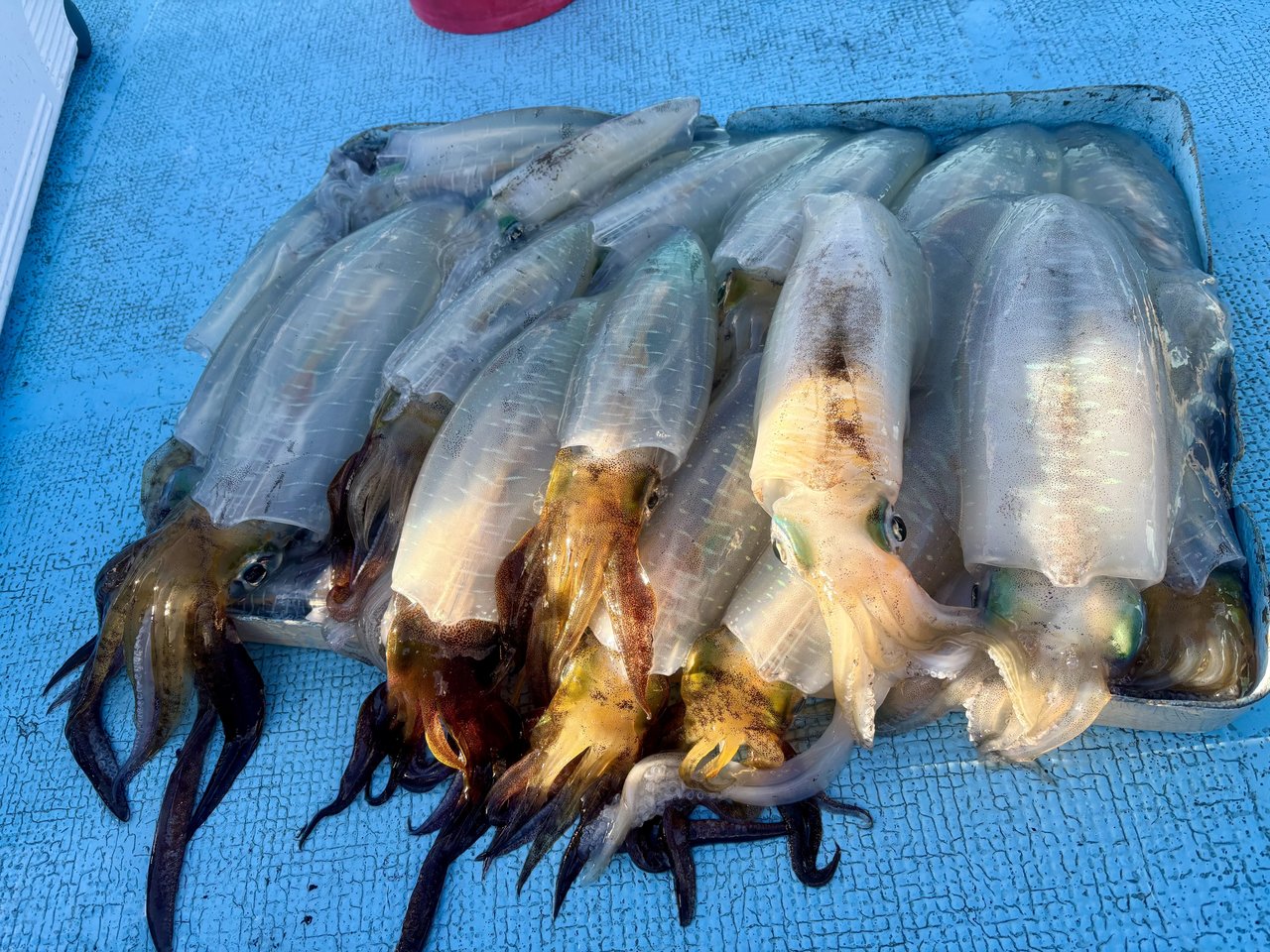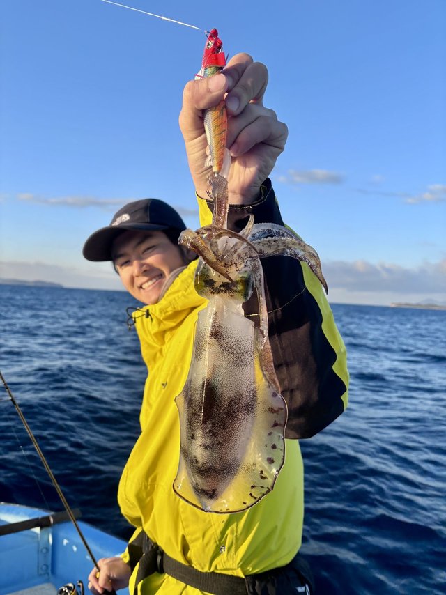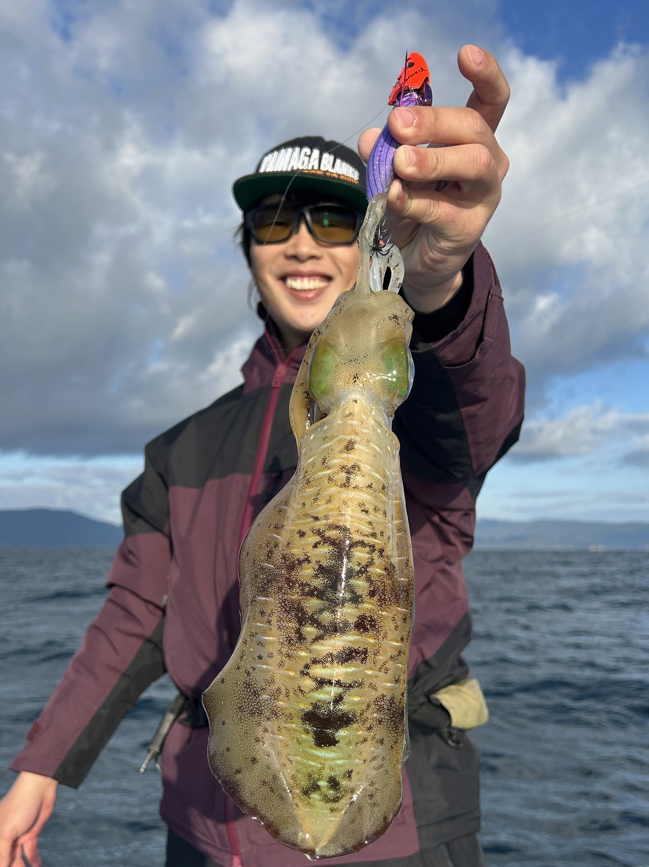 前回の惨事(水面バラシ2回)を目の前で見ていた船長が飛んできて横でドラグを調整したりしてもらったりしながら、やっとあがったのはモンゴウイカ!笑