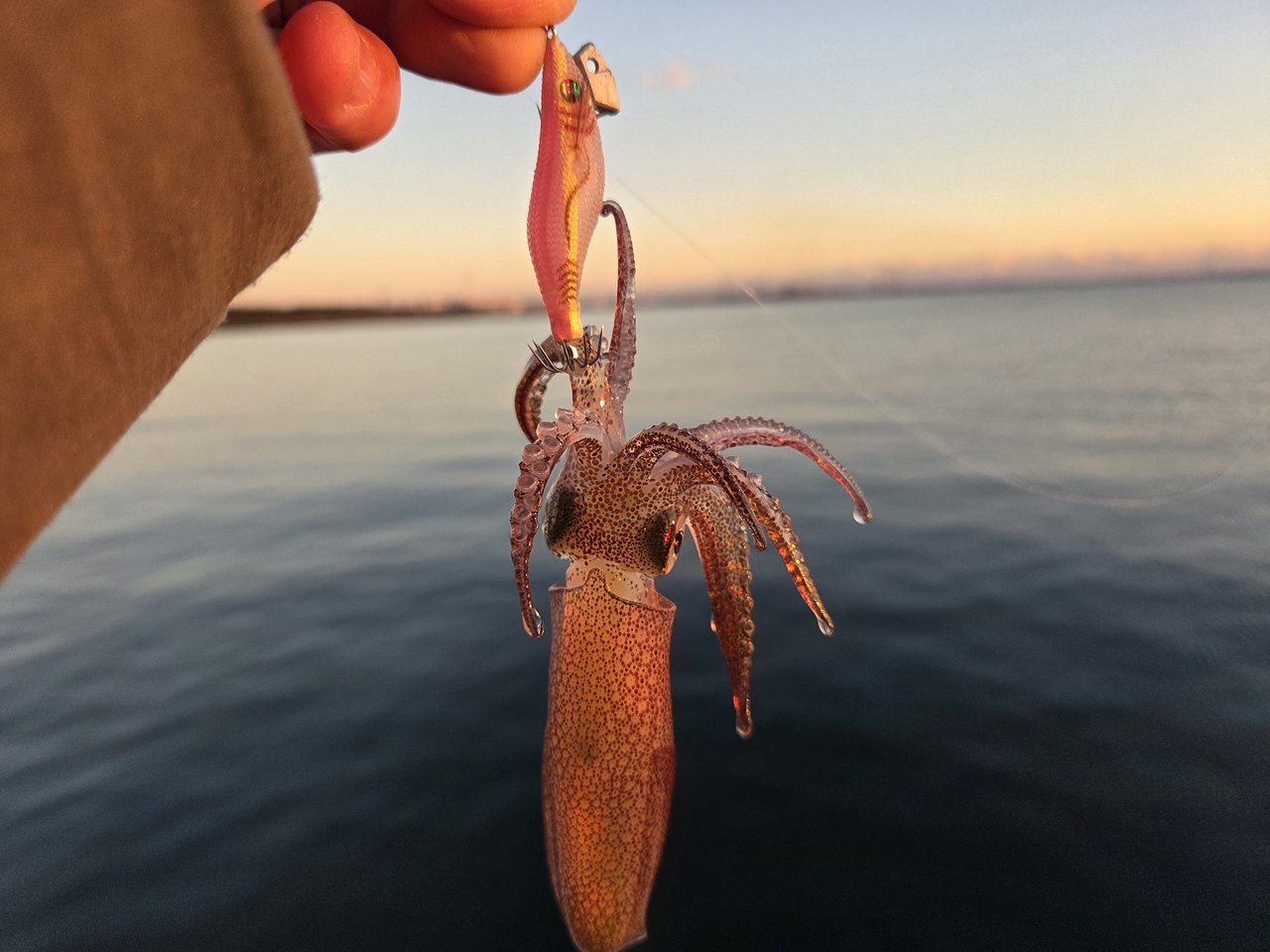 まだ明るい時間帯にスクイッシュを付けた仕掛けで、小ヤリイカを釣り上げるもその後暗くなるまでは反応は無し・・・。