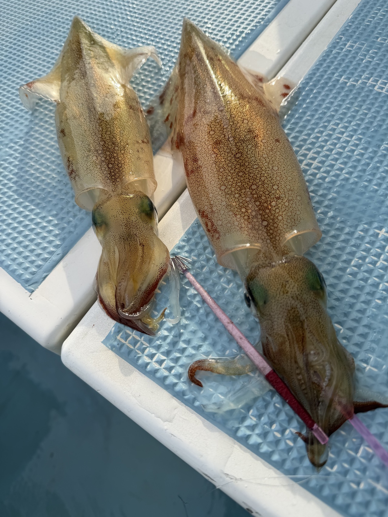 泉バイパス店、脇神です^^GHMさんに一泊して、釣り2日目。この日は生憎?のピーカン無風。前日の対角に着座、魚探の反応は変わらずで終日底から25センチ以内の釣りでした。難しい釣りは引き出しがない私には攻略できないので、ひたすら下針と上2つのエサを交換!魚のサイズがマイクロと9センチ前後の良型でごちゃごちゃなので当たりの出方、手感も狂いまくり、、、ある意味とても楽しい1日でした。オマツリ頻発するのでおもりは重たく、仕掛けはたくさん用意してチャレンジしてくださいね。詳しくは売り場にてお尋ねください(^O^)ノ