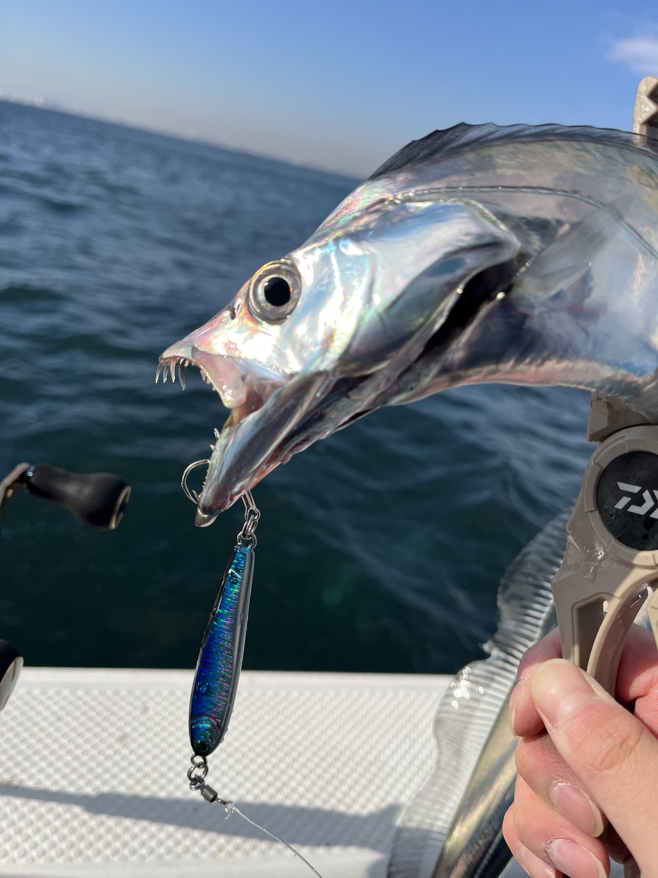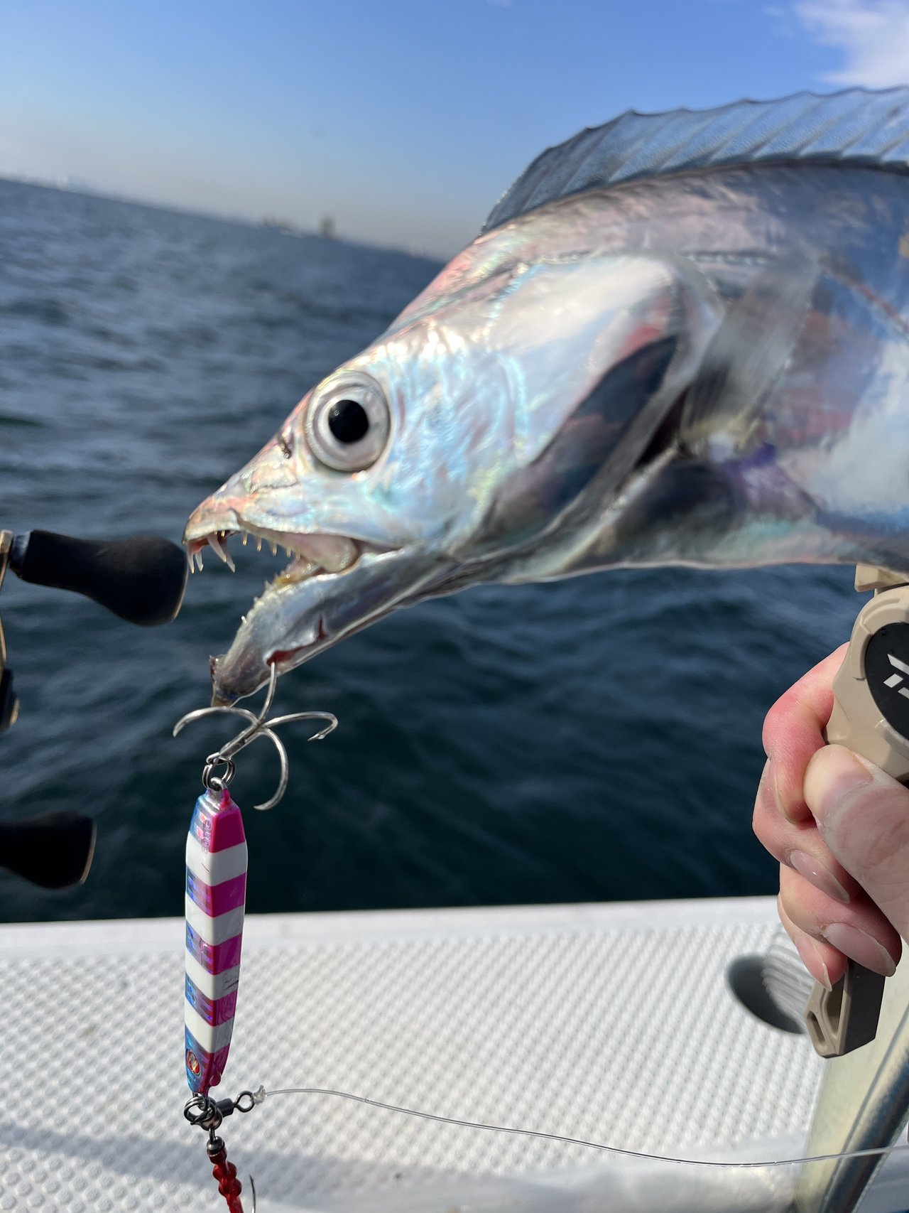 当日は終日25m前後の浅場で使用したジグは60~80g。朝一にパタパタ釣れる時間あるもその後は拾い釣りのような展開に。13時頃から潮動き始めチャンスタイムありました。フォールでのアタリが多く中々巻きのパターン掴めず結果7本と伸ばせず。しかし、今時期のタチウオはコンディション良いため、数本でも十分お土産になりますよ。