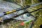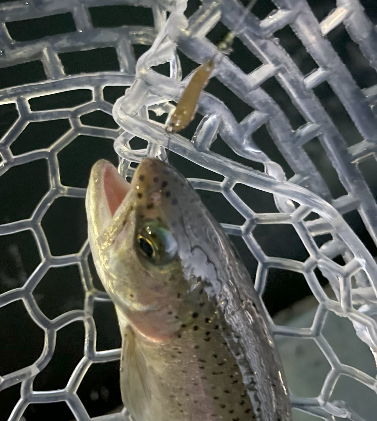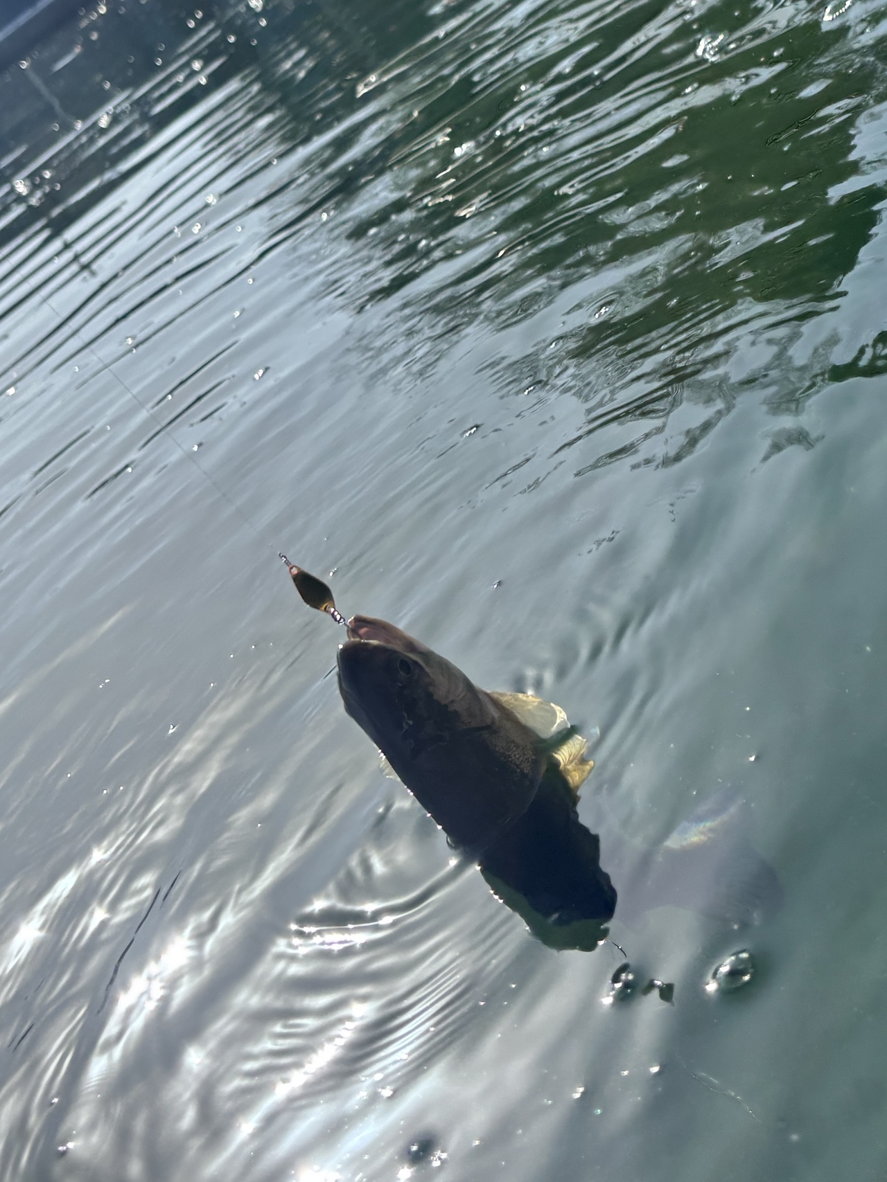 最後にトラウトエリアに行きましたが強風の為落ち葉が多く浮いていた為中々スプーンを引くのは困難そうでしたが1投目で釣れました。