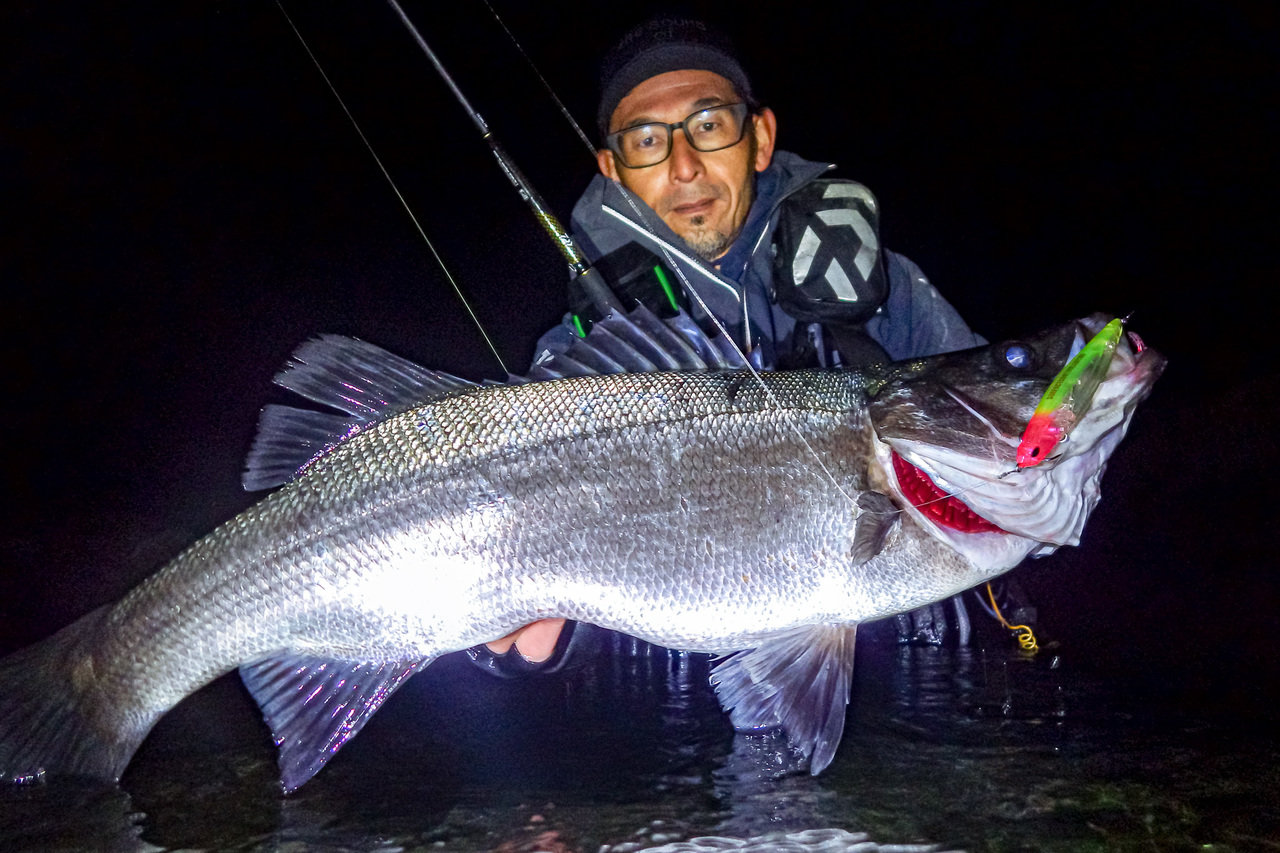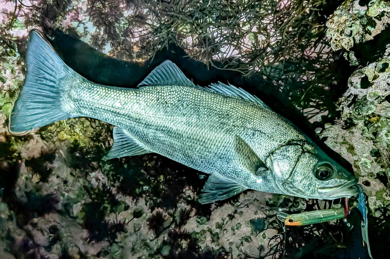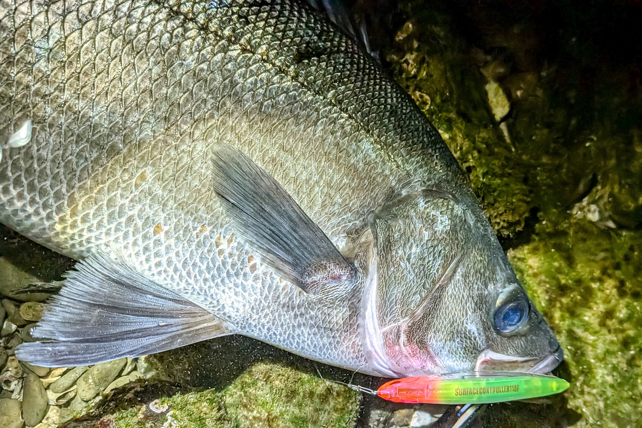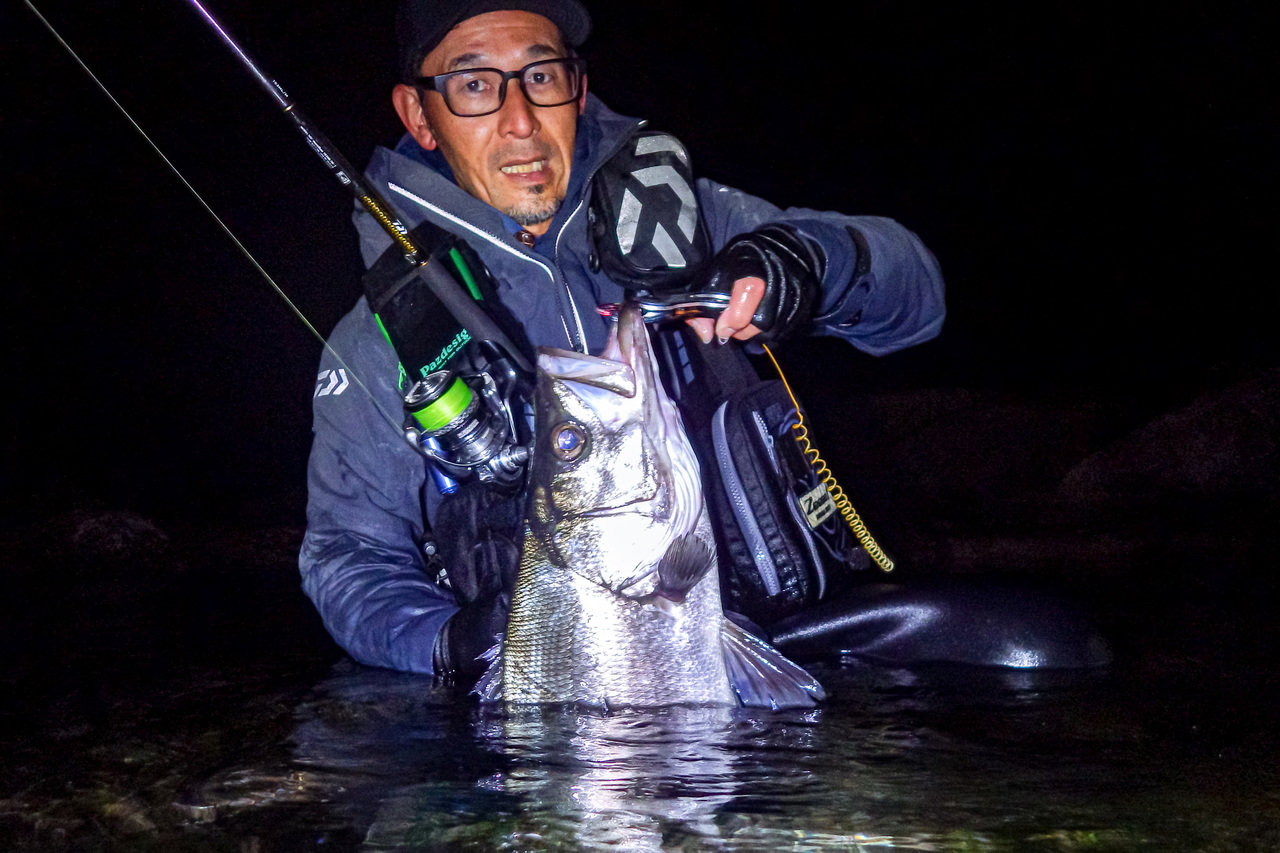テッパンのグースで手前の魚を拾った後、サーフェイスコントローラー118ド遠投で沖の岩盤上で追加の1本。魚は太く、とんでもない体高でめっちゃパワフル!