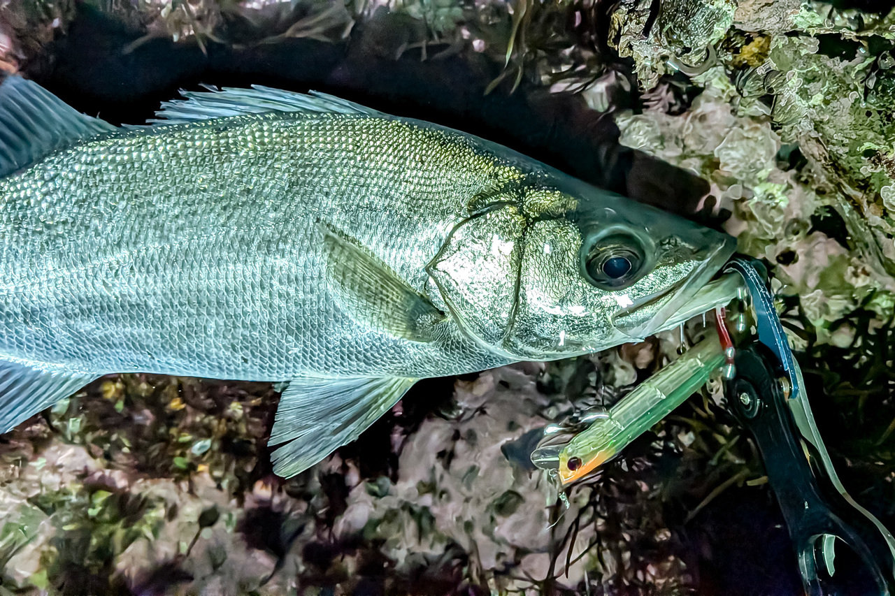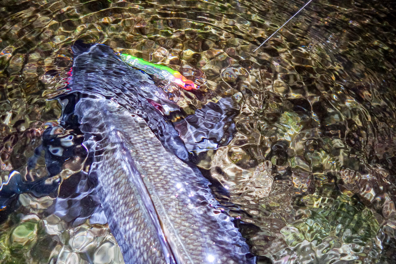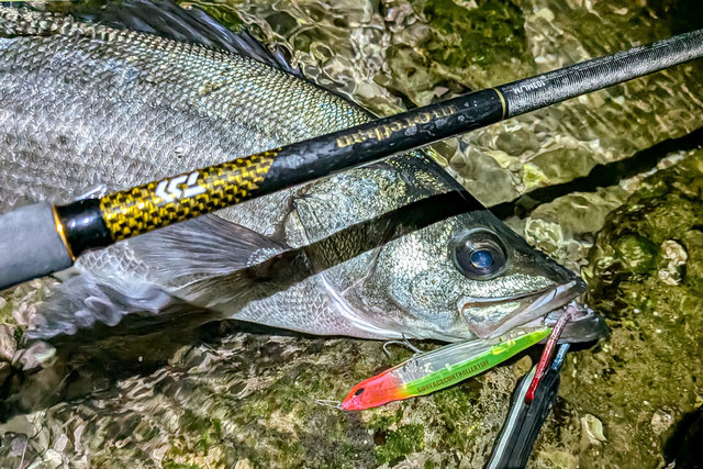 しっかり竿を立ててバットを効かせ、沖で浮かせて手前の岩だらけの危険地帯は水面を滑らせて躱せました。パワーは十分ありますね!