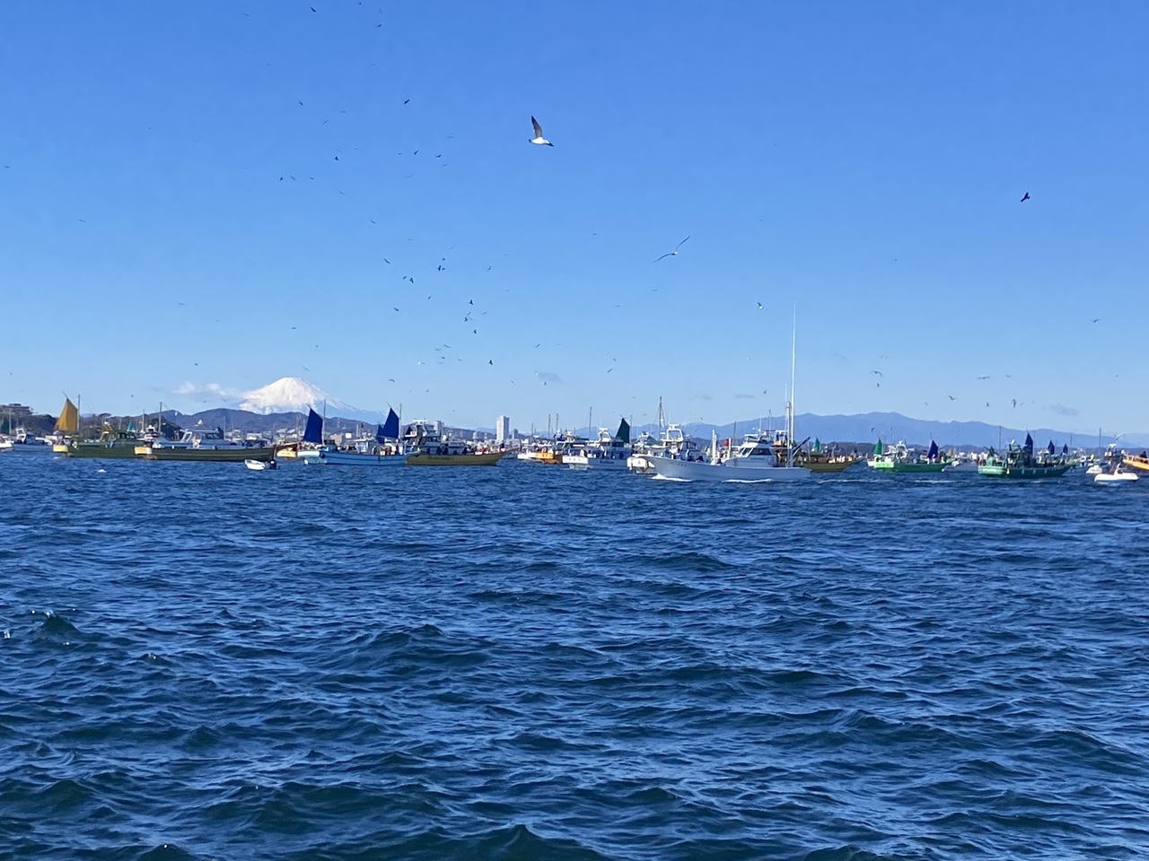 船上もツルツル。細心の注意を払って準備します。いざ出船~向かう釣り場は観音崎沖!たくさんの船が密集してました。