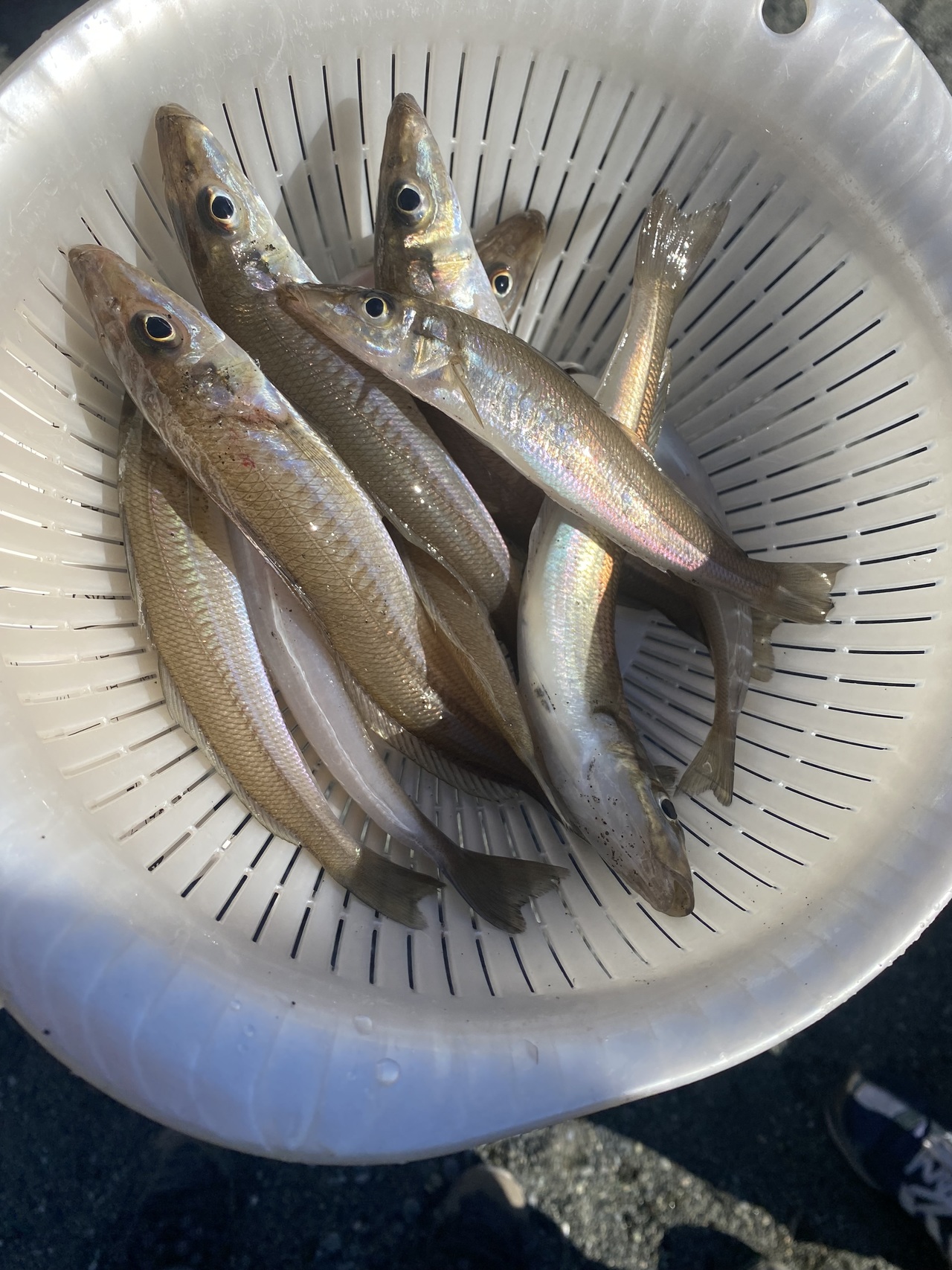到着早々に良型のキスを連掛けしてる人がチラホラ・・・きっと私にも!と思いながら9時を過ぎても1人ボウズ。。。その後やっと待望のアタリが出て粘りに粘ってグチャグチャの良型4連でホッとひと安心!