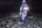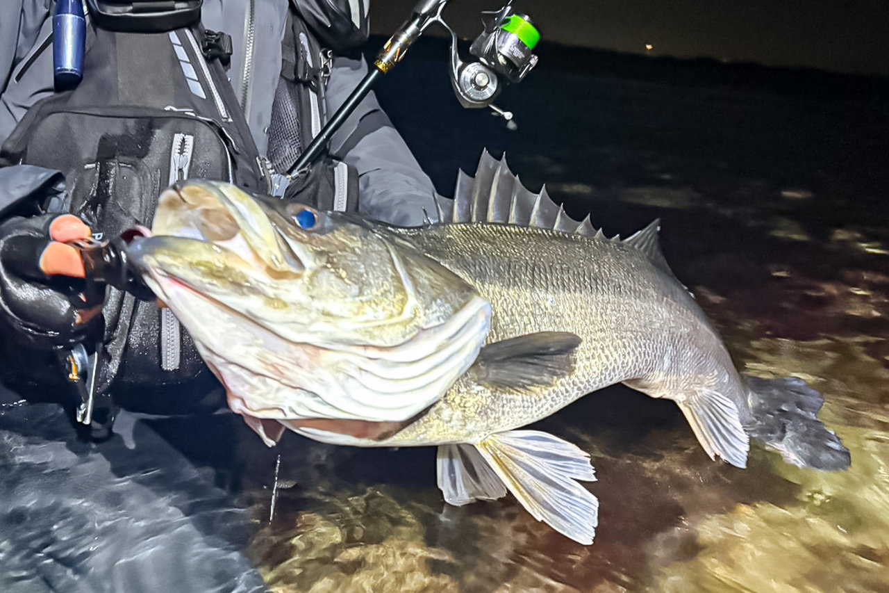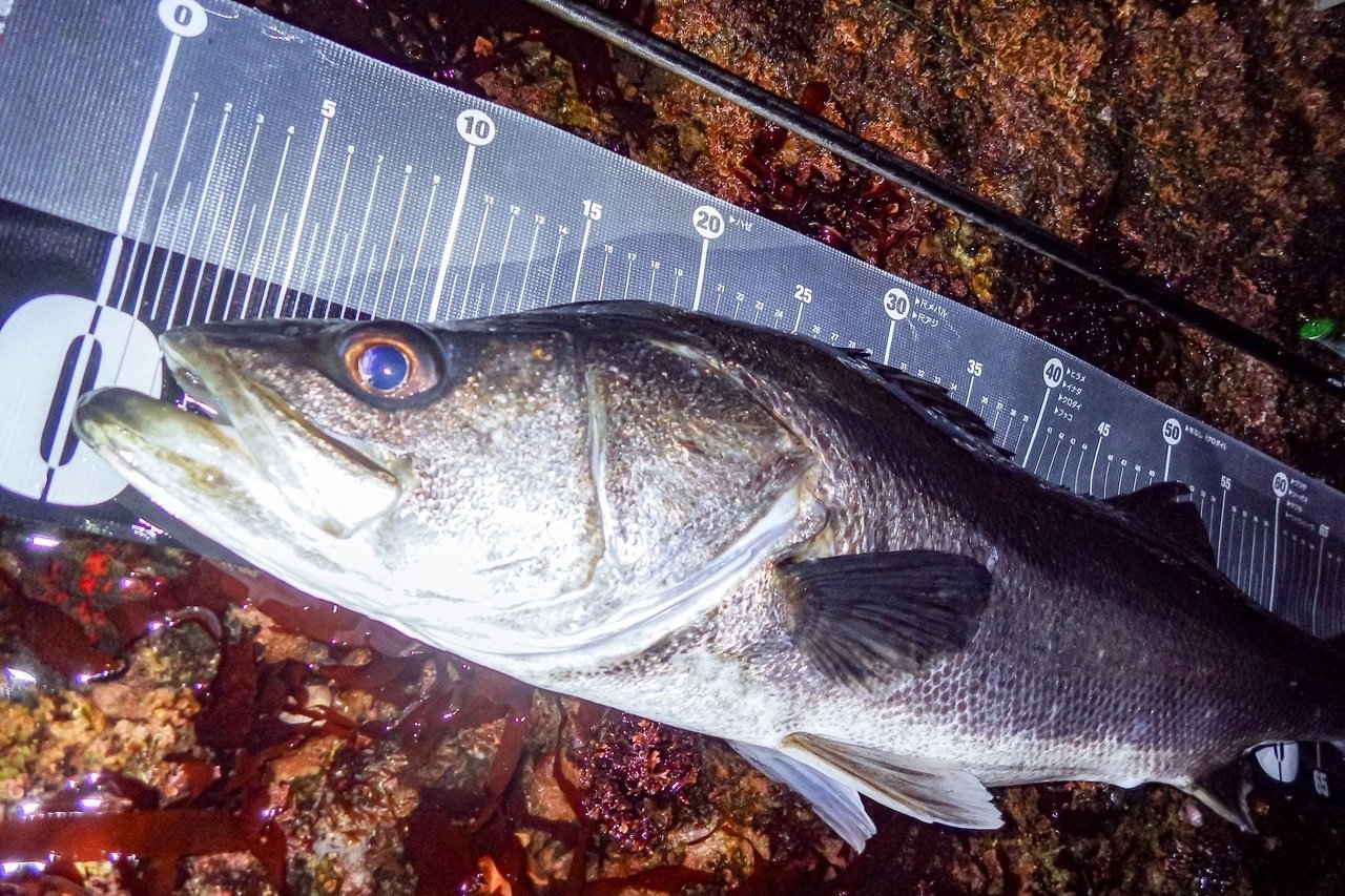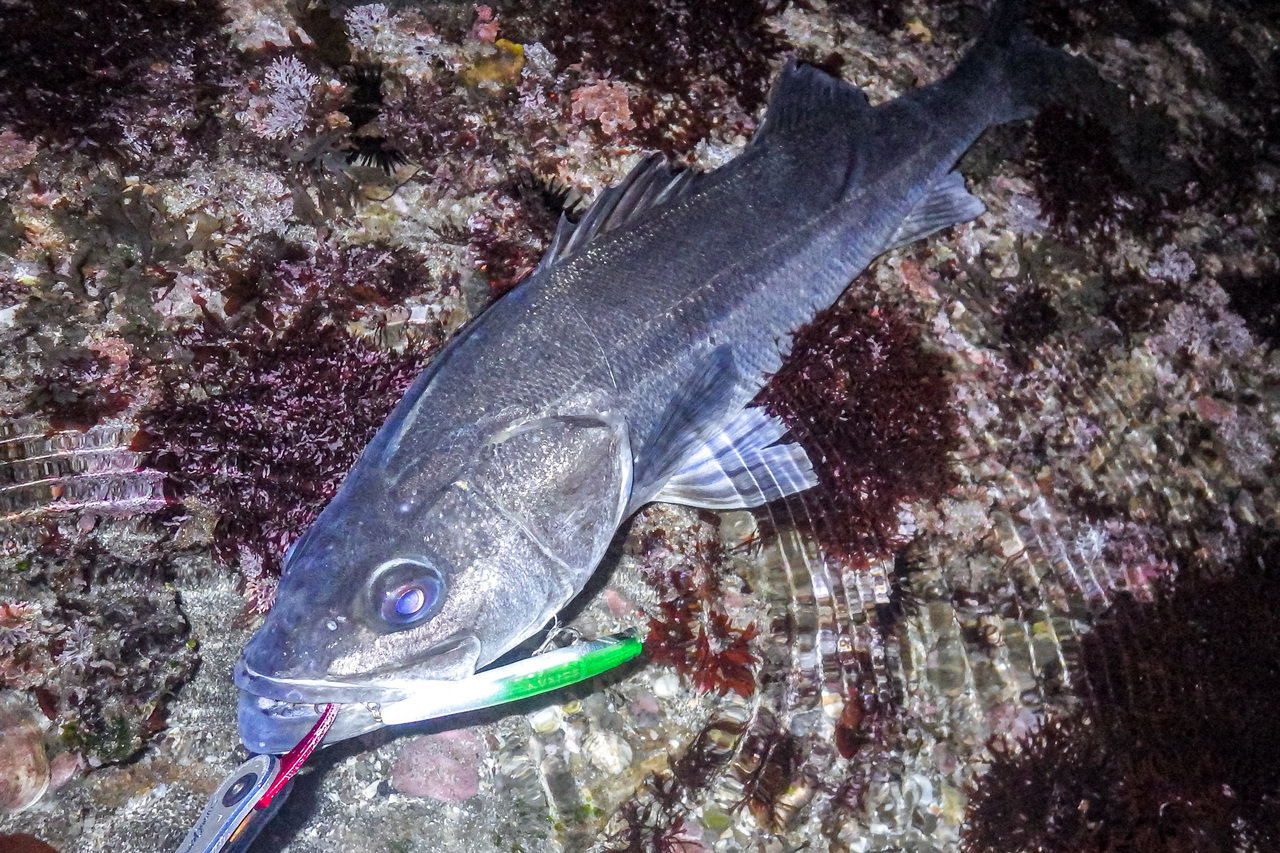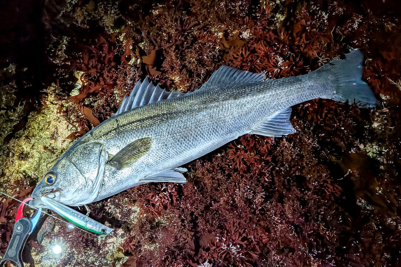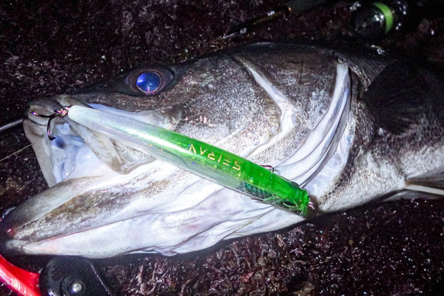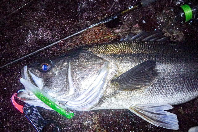 その後、ちょっとだけラインを変えて探っていると、さっきより重たく強い流れを発見・・・と、思った直後、引ったくるアタリ。重い首振りをいなして寄せてくると、厳つい頭のマッチョなシーバス。岩場にズリ上げランディング成功!大晦日に次いでランカー捕獲、うまく行きすぎてなんか怖い(笑)。