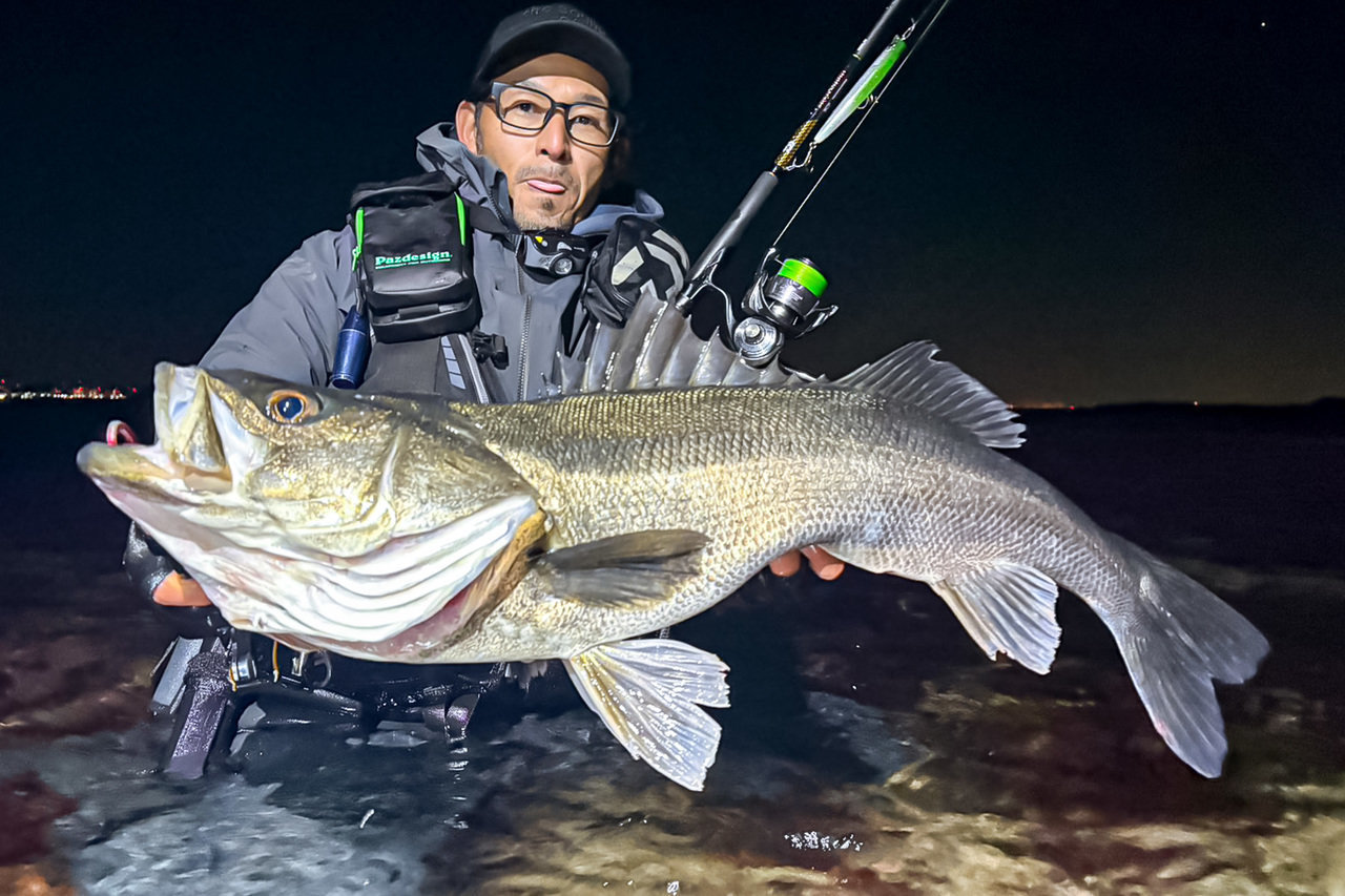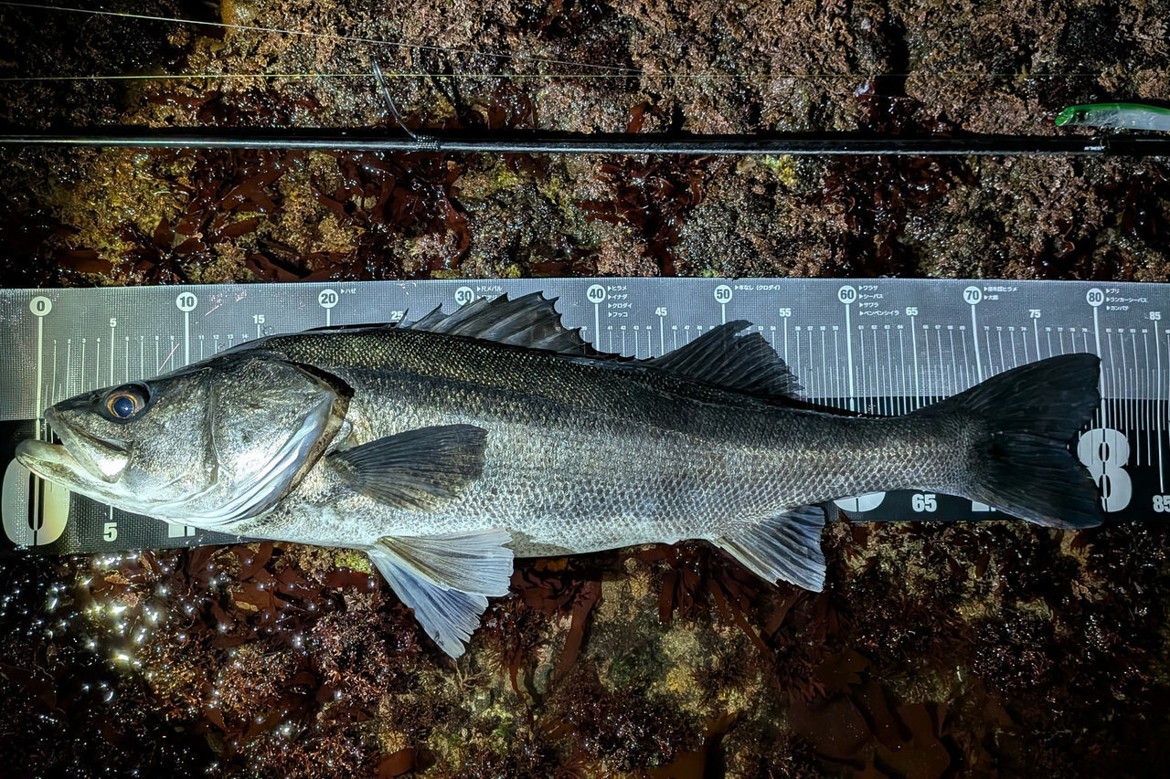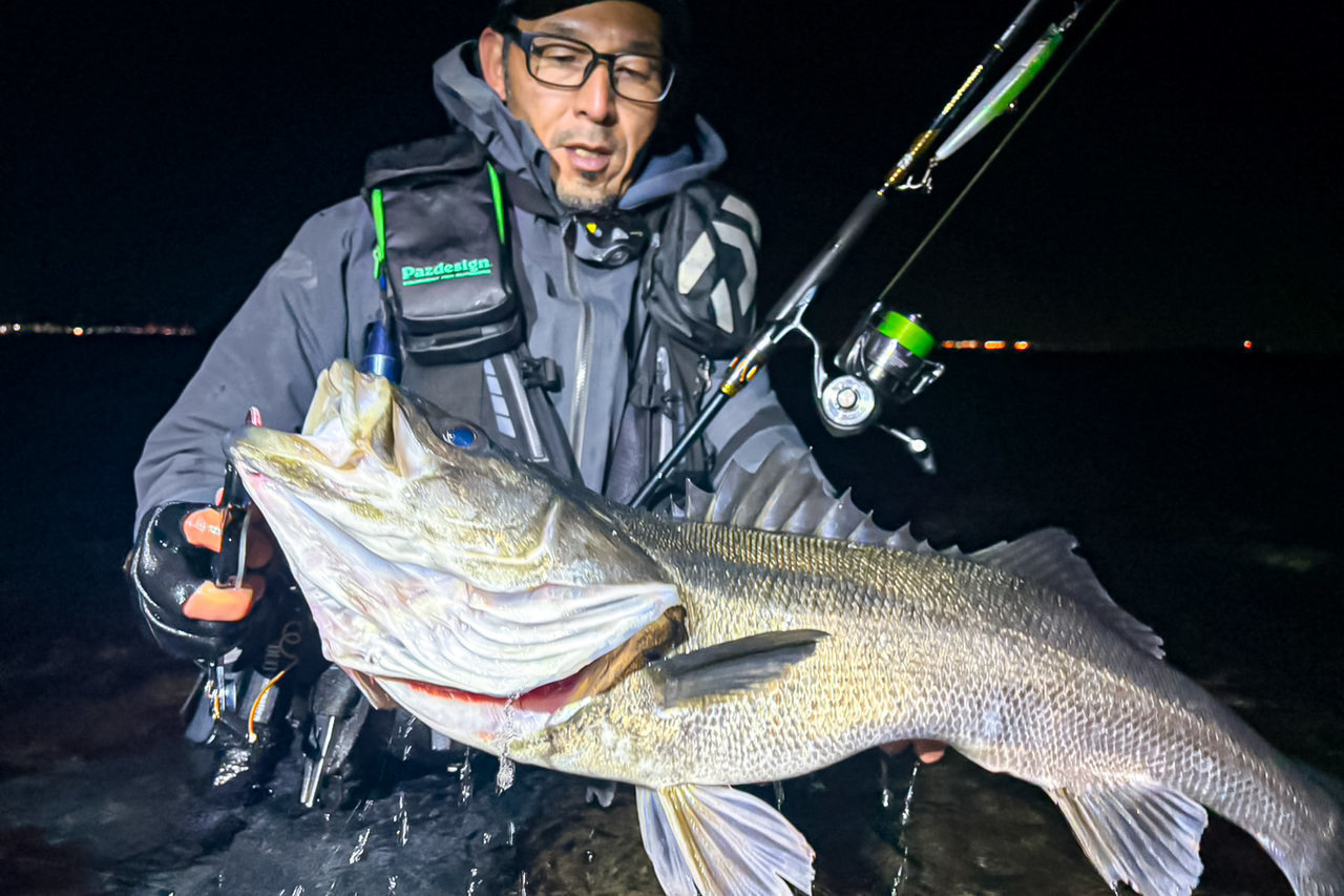 岸から沖に向かうカレントと岩礁の切れ目が重なるラインを発見!セイランを風に乗せて遠投、そのラインを舐めるように引いてくると、「ゴゴっ」と堅いアタリ。同じパターンで次のキャスト。今度は、しっかり掛けて、2026年初シーバスをキャッチ~(嬉)!