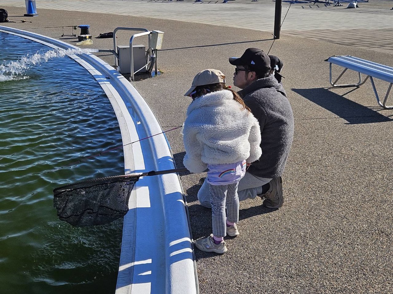 午後券の発行に合わせて12時頃から釣りをスタート。放流日とのことで周囲はよく釣れてます。風が以外に強く、子ども達にはかなり難しい状況。それでもスタッフ小泉がしっかりと面倒をみてくれたお陰で家族で楽しむことができました。