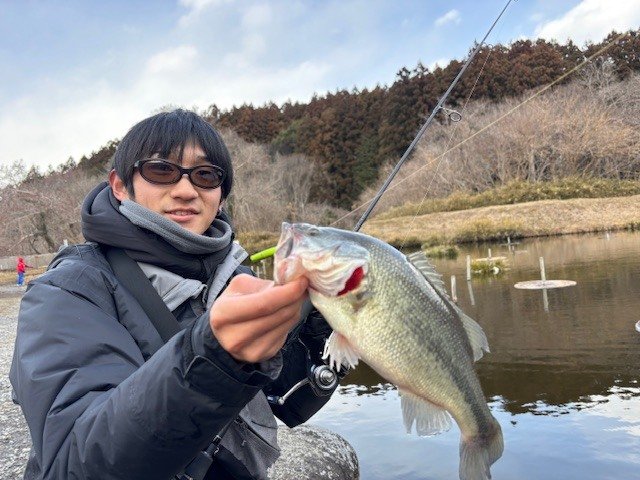 お昼頃はちょこっとバスポンドで釣りしました。「1匹釣れたらエリアトラウトに戻ろう」そして開始10分ほどで中村さんがバスキャッチ。