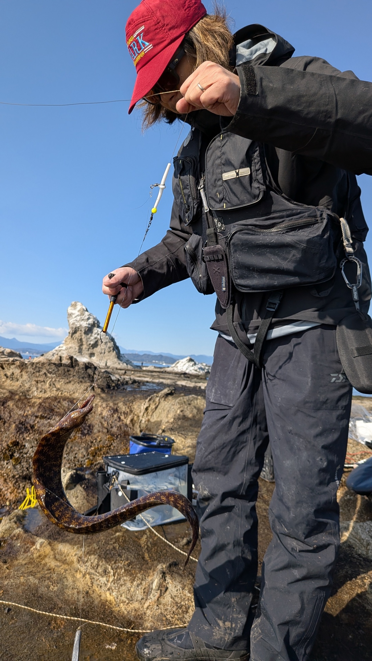 今回はイシダイ釣りに目覚めた隣のデスクのキタニと同行。わたしはルアーヒラスズキ、エギング、青イソメでカワハギ、アカハタを釣りたくて道具を山ほど持ち込みチャレンジ。