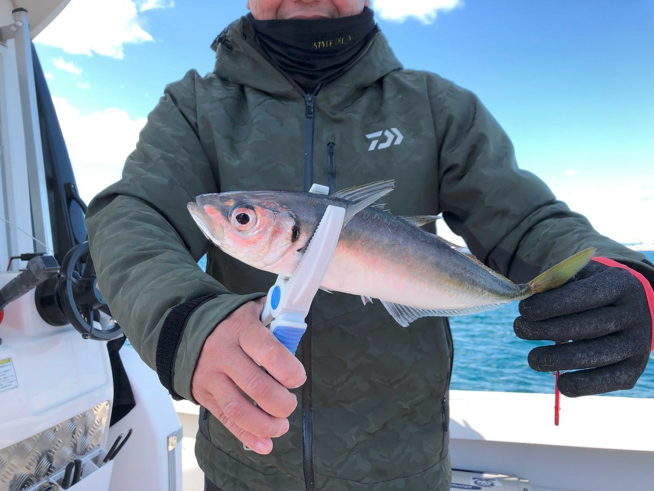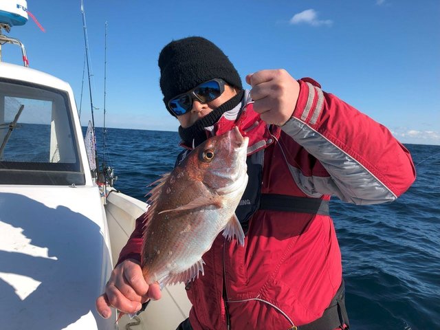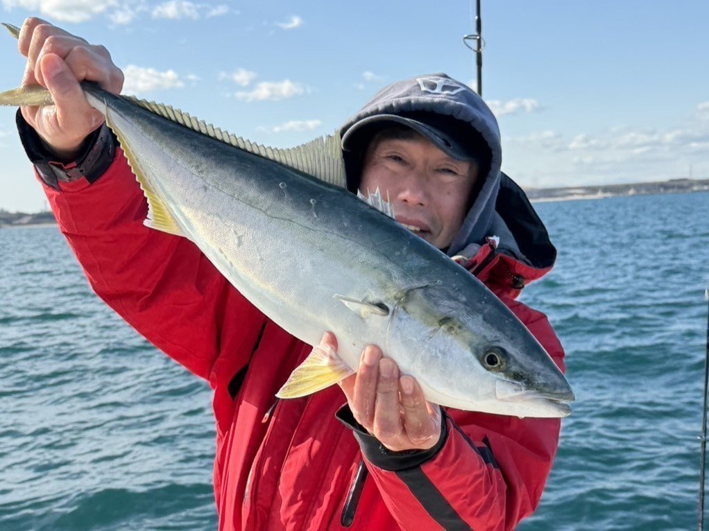 冬の快晴の中、根魚五目狙いで出船。予報以上に西からの風が強く40m~のポイントで流しながら鯛ラバで誘う。水温15℃~あり、マダイ、カサゴ、ホウボウ等がポツポツと釣れたがアタリ少ない。反応も少なく冬の海?ポイント移動を繰り返しているとベイトの反応ありジグで誘うと30cmクラスの良型マアジをゲット!マアジの入れ食い?と、思ったらジギングで青物の入れ食いタイム!イナダクラス~良型ワラサクラスも釣れてタイムアップ。沿岸は11℃台の冬の海でしたが最後に釣れて楽しめました。
