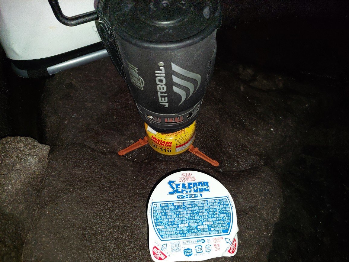 背負子を担いで真鶴地磯にアタック!いつもの場所に入ります。まずはジェットボイルでお湯を沸かしカップ麺で腹ごしらえ。体を温めます。