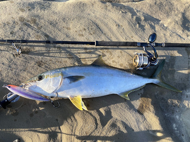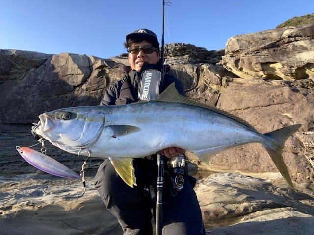 例年ここのポイントにベイトが入ってヒラマサが・・・っというタイミングを狙いましたがポイントに到着するとベイトは皆無、更にベタ凪。地磯なので潮に合わせてポイントを替えながら、潮替わりや朝マズメ等のタイミングにワンチャンスがあるも出るけどノラない、フッキングしてもバレるで大苦戦。やっとヒットさせたヒラマサは10キロオーバーはありそうでしたが最後は痛恨の敗北で3日間まさかのボウズ。最後の最終日。フェリーの時間もあるので朝だけの勝負。エリアを変え、今回は初のポイントでしたが過去に実績あるポイント。朝マズメにヒットするも食いが浅いのかまたもやバラシ。その後反応はなく心が折れそうでしたが最後の潮が緩むタイミングに遂にヒット!やっと無事にキャッチ!けしてデカいわけでもないですが最後の最後に感激な1本でした。