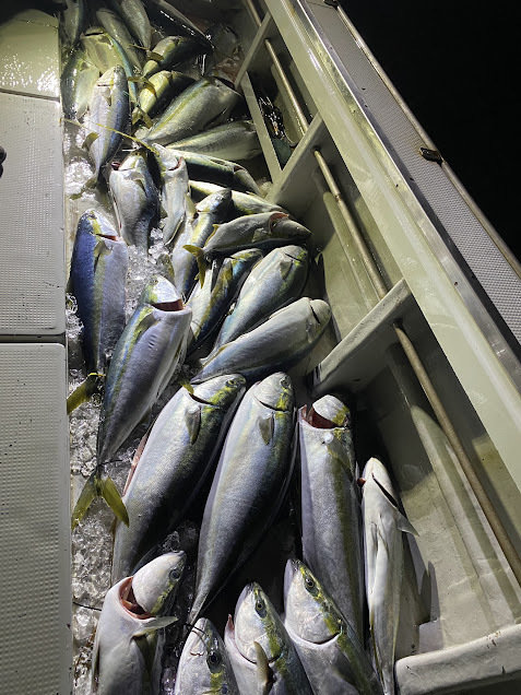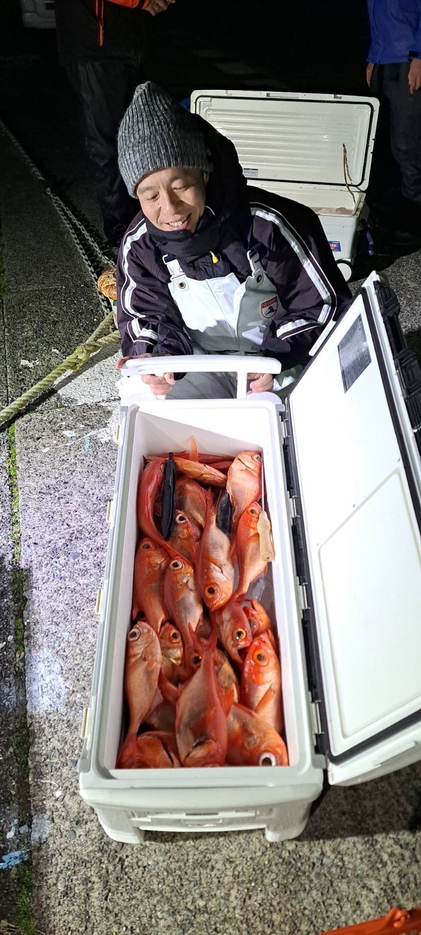 今期好調の夜キンメ。50リットルクーラー満タンを目標に行ってきました。1投目から5本針にパーフェクト、ハリスはチリチリでも急いで投入、2投目は4点掛けと好調な滑り出しにクーラー満タンかも~とニヤついてましたが、そう上手くは行かず、途中食い渋りや喰い棚が100M位広く、当たり棚を見つけるのに苦労し、好調とは言え、なかなかテクニカル。短時間勝負なのでとにかく忙しい、あれやこれやと試行錯誤し、なんとか45匹ゲットする事が出来ました。