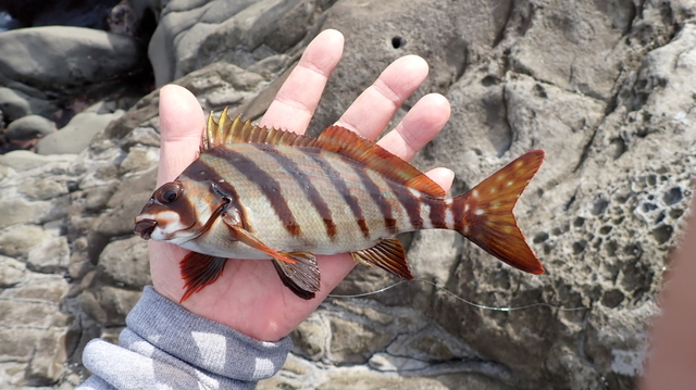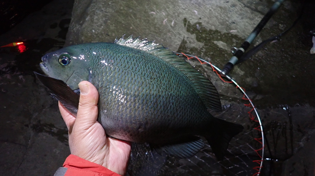地磯のメジナ釣り行って来ました。夕マズメ狙いののんびり釣り。場所は神奈川小田原根府川大根近辺、凪だったのでゴロタの狙い、良く太ったメジナが釣れました。ゴロタの太仕掛けだったので数回あたりがあったのですが喰い込まず。小針の細仕掛けなら数匹釣れたかもしれません。