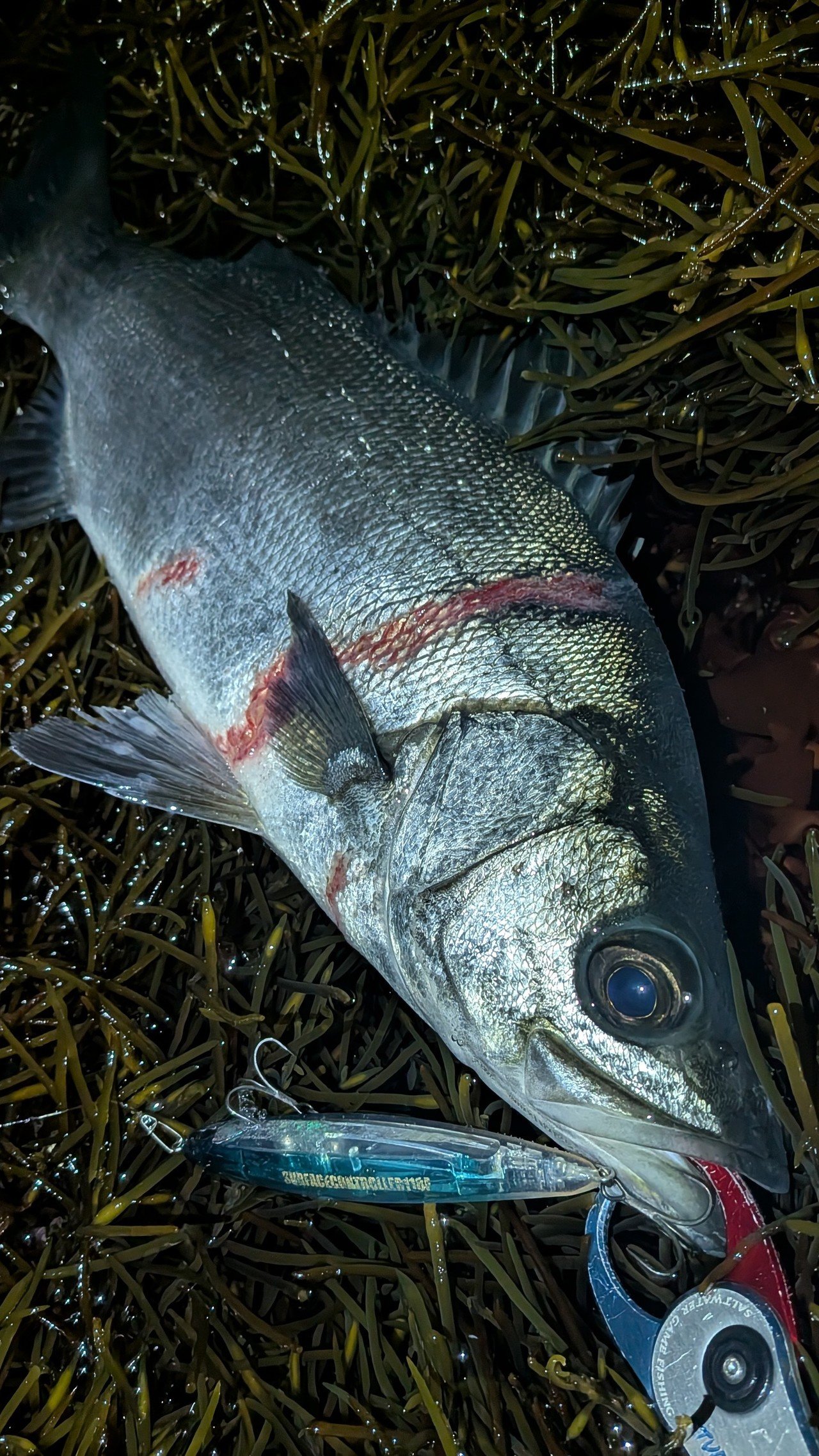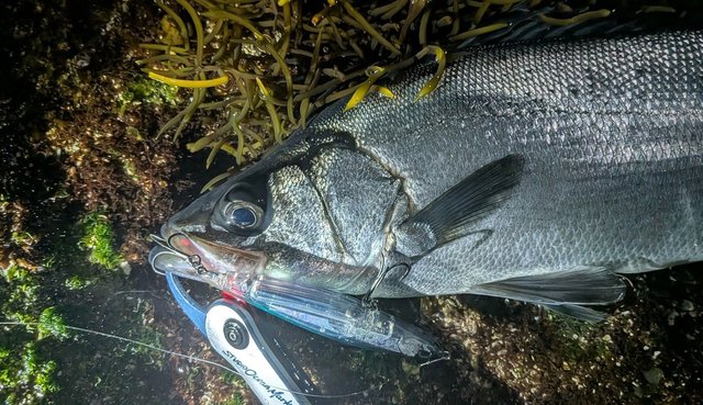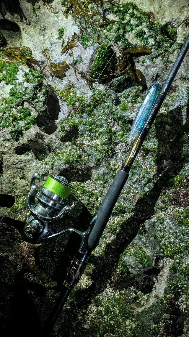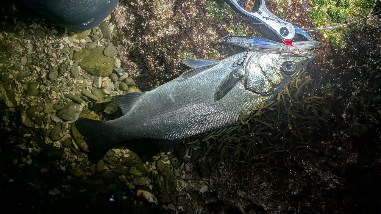 予測よりも30分ズレてアタリが出だしたけど、かなり根の際ビタビタに攻めないと全く触って来なかった。少しでもルアーレンジが下がると沈み瀬の上の海藻に刺さるので、引き波を受けても潜らないサーフェイスコントローラーの独壇場となりました。アタックが5回、キャッチは2本、ムズ楽しい!?夜ヒラゲーム。闇夜、澄み潮、カラーはシースルーキビナゴがお気に入りでした~。おわり。