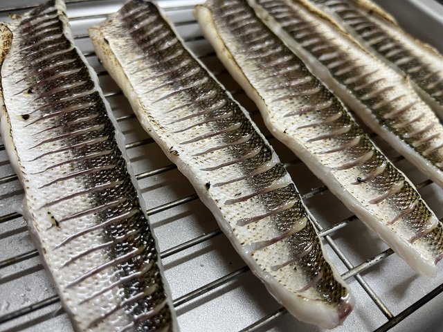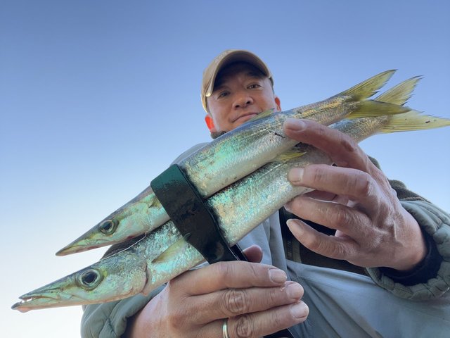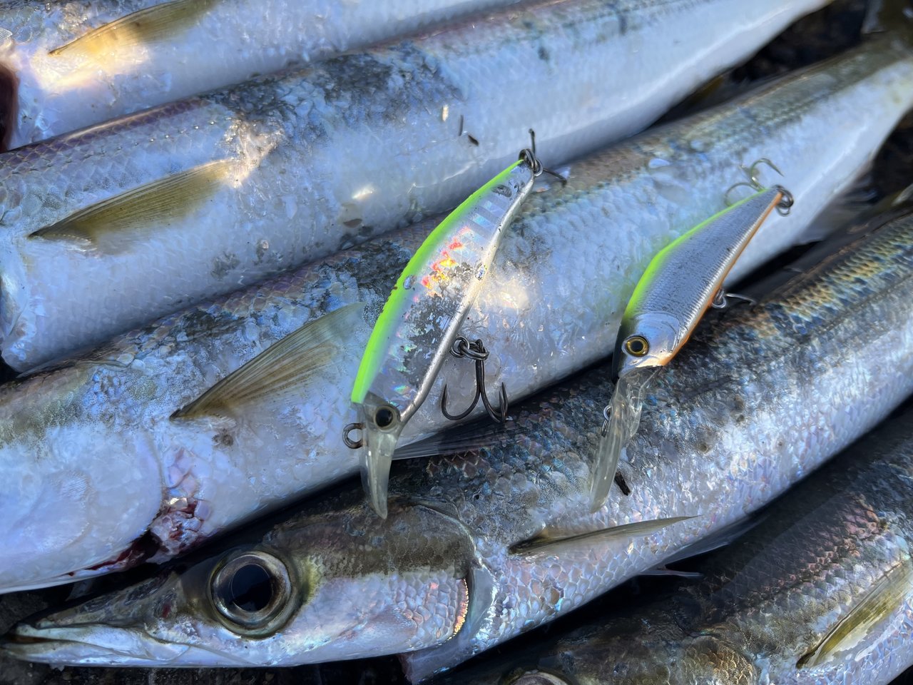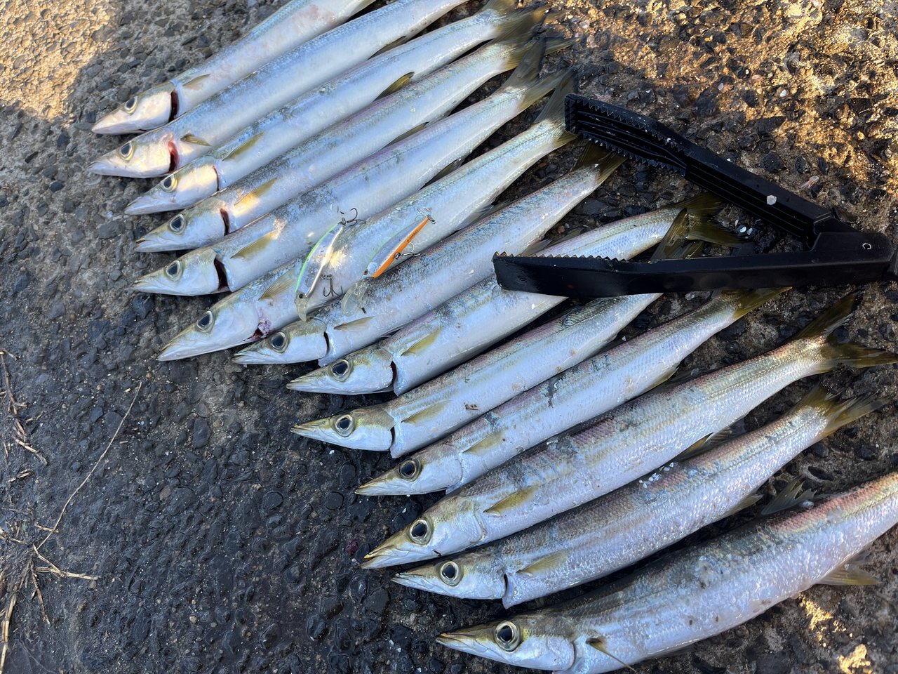この日も夜ご飯の食材確保にカマゲー「カマス狙いのプラッキングゲーム」に行って来ました。必ず訪れる「時合い」待ちしつつゲームをスタートすると・・・来ました良型サイズ!潮位が低く足元から水面までの高さがある状況でしたので水をしっかり掴む(スミス)D-ダイレクトが大活躍☆コンスタントにアタリを拾えて14匹をキャッチ!※画像のカマス集合写真は13匹になっていますが実際には血抜きしている水汲みバケツに1匹残っており、うっかり溜め置いた海水と共にオートリリースする所でした(笑)帰宅後はもはや定番の皮目を炙り刺身に!秒で無くなりましたので再度行かねば。