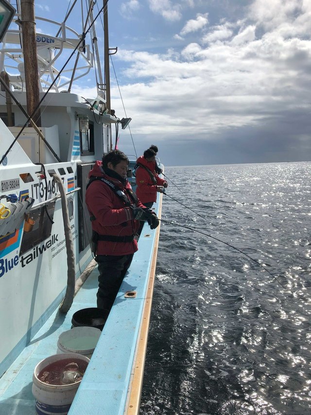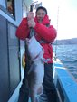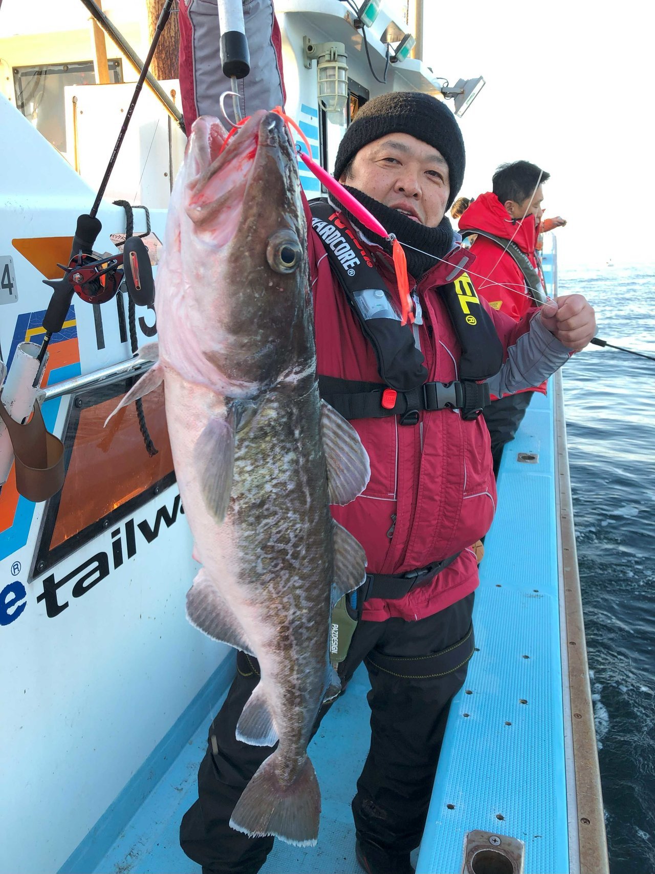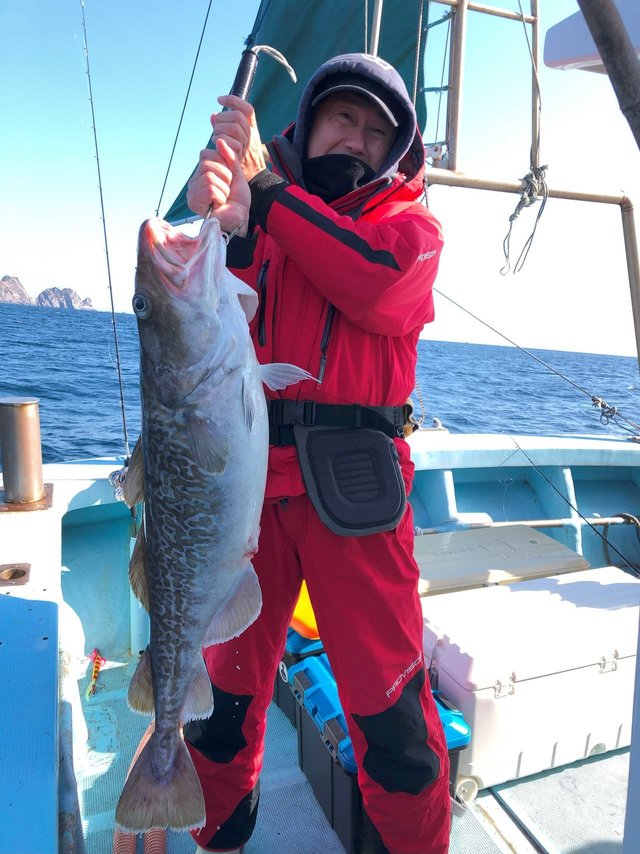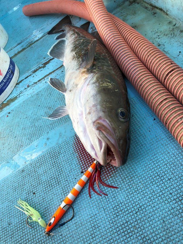 産卵後のマダラジギングで越喜来湾喜多丸さんで釣行。出船して湾入り口付近で反応があり船長指示で一投目投入、ボトムを取って2~3シャクリでドン!鋭いアタリ!合わせを入れフックング!グングンとした引き味を味わいながらケット!4Kgクラスの良型アベレージサイズで今日の釣果期待が膨らむが、それからが修行。反応に乗せてジグを落として誘うが拾い釣り状態・・・。中盤以前のヒットカラーに変えてボトムから2シャクリで鋭いアタリ!今日一番の引きを味わい水面に現れたのがTG(ジャイアントタラ)?久しぶりに大型9Kgアップを見事にゲット!そのあともポイント移動を繰り返すも状況変わらず・・・。後半帰港しながらの流しで同行者に強烈なアタリ!下から10mレンジでヒット!デカい!の一言。慎重に巻き上げ無事ランディング!船上計測10・5KgまぎれもないTGでした。数は出なかったがサイズが出てくれて明日2日目に期待して終了となる。