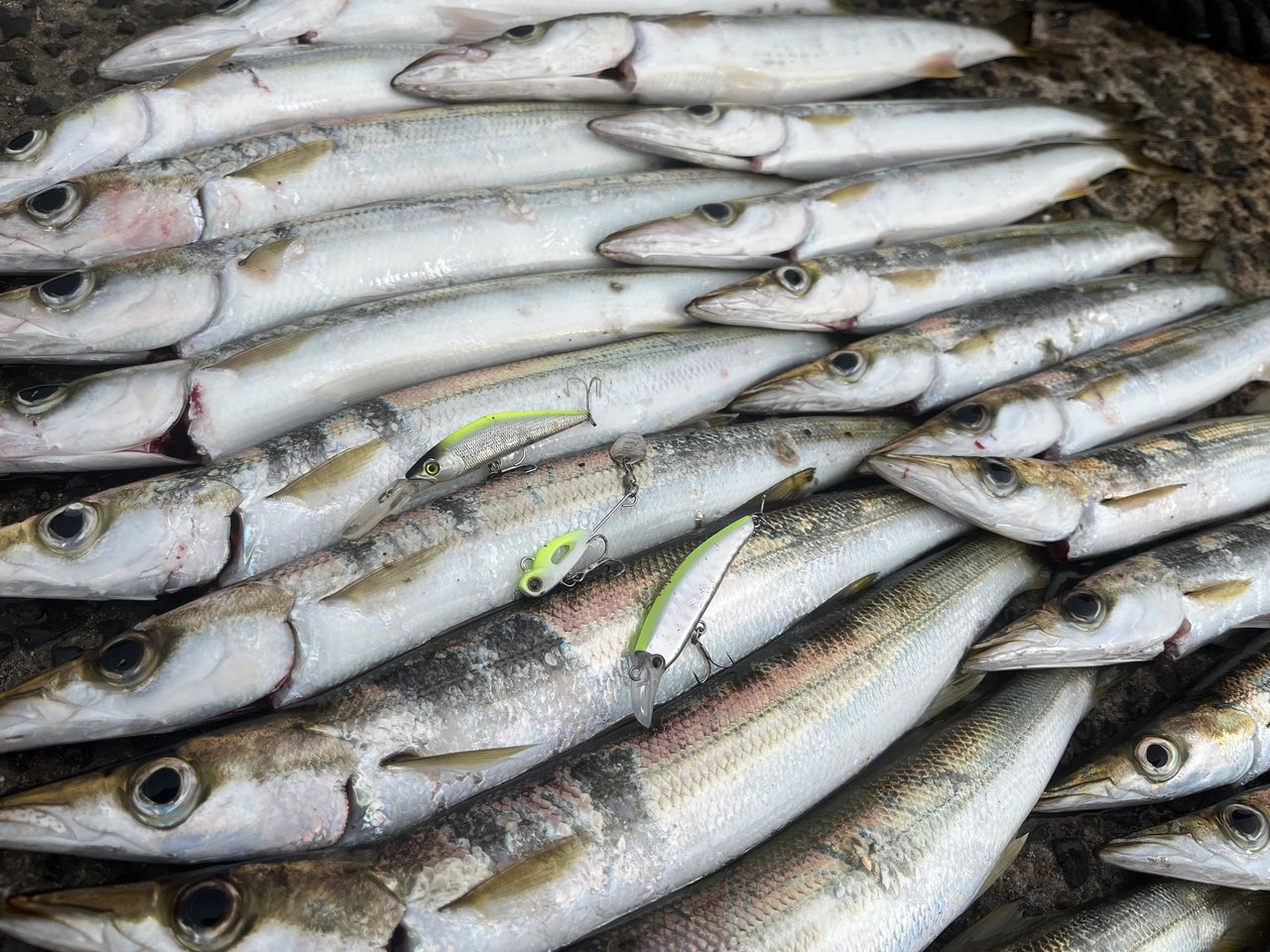 この日もカマスゲームに出勤!釣場に先行していた福岡店スタッフの佐藤さん・福嶋さんと合流してゲームスタート!いつも通り時合い突入するとバイト連発となり入れ食いに☆型も良くコンスタントにヒットして夕ご飯の食材確保には十分な数を釣れた所で終了しました。今月いろんな潮周りで釣行してパターンとしては潮が小さい【小潮】で下潮止まり前後が良く釣れる事が解って来ました!まだまだこのまま続きそうな群れが居ますので食材確保釣行してみます。※先行していた佐藤・福嶋ペア―よりササイカを頂戴したのでこの日の夕ご飯は更に秒で無くなりました(笑)