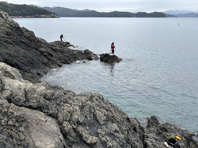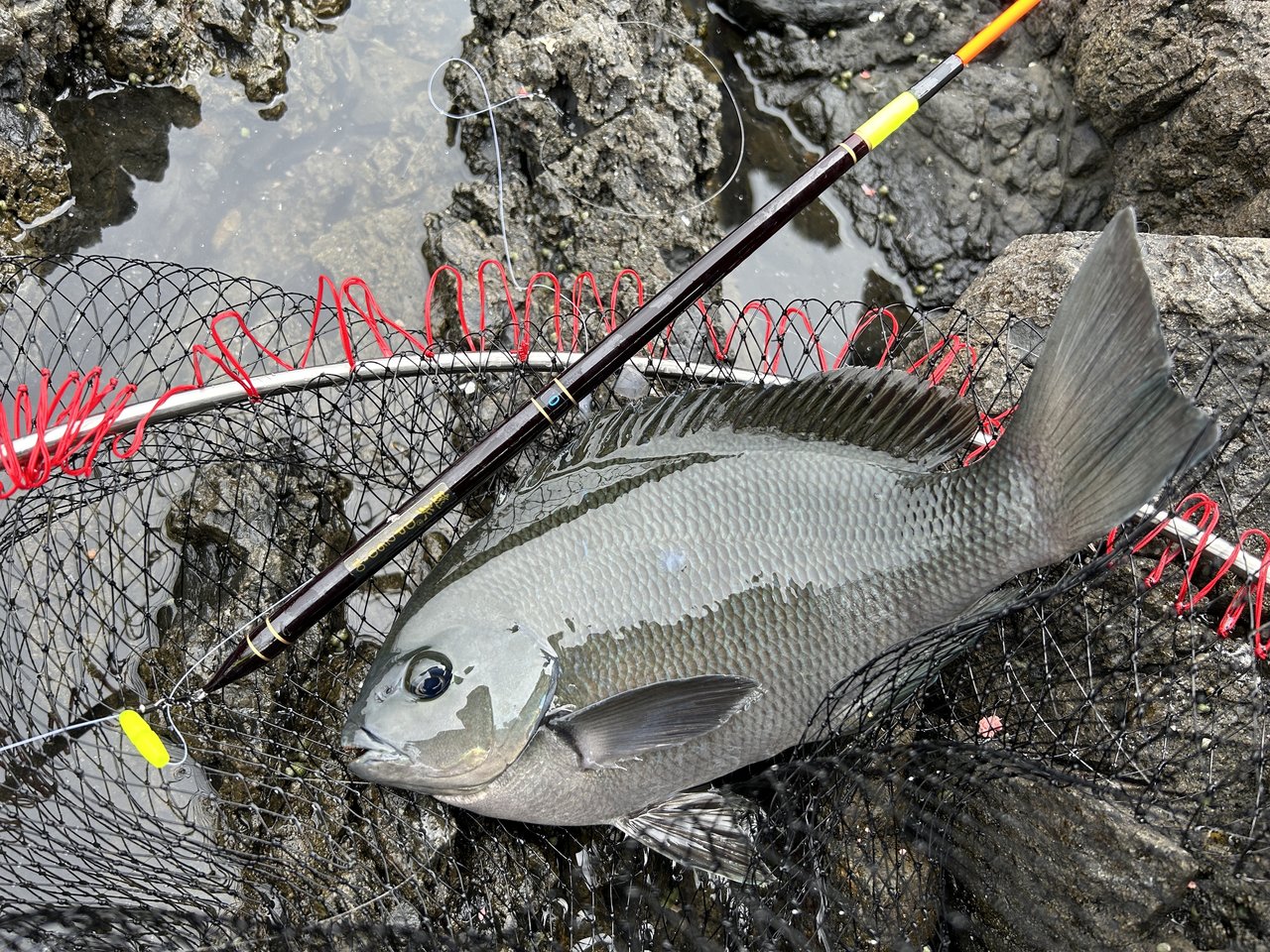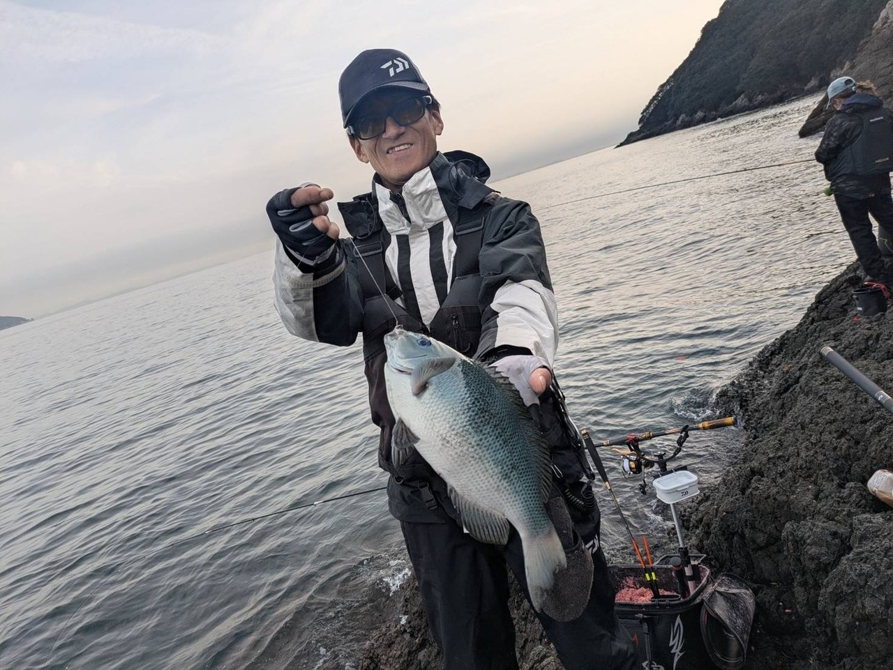 シュロアモール筑紫野店のメンバーで大分県鶴見の磯へクロ釣りに行ってきました。釣り始めからポツポツとクロが釣れますが、チャリコやカワハギなどエサ取りもいる状況でした。いつもの棒ウキ半遊動仕掛けで、ウキ下は3ヒロから竿1本ちょっとの間で調整しました。アタリがあっても喰い込まないケースも多く、途中からは掛けアワセが良かったです。