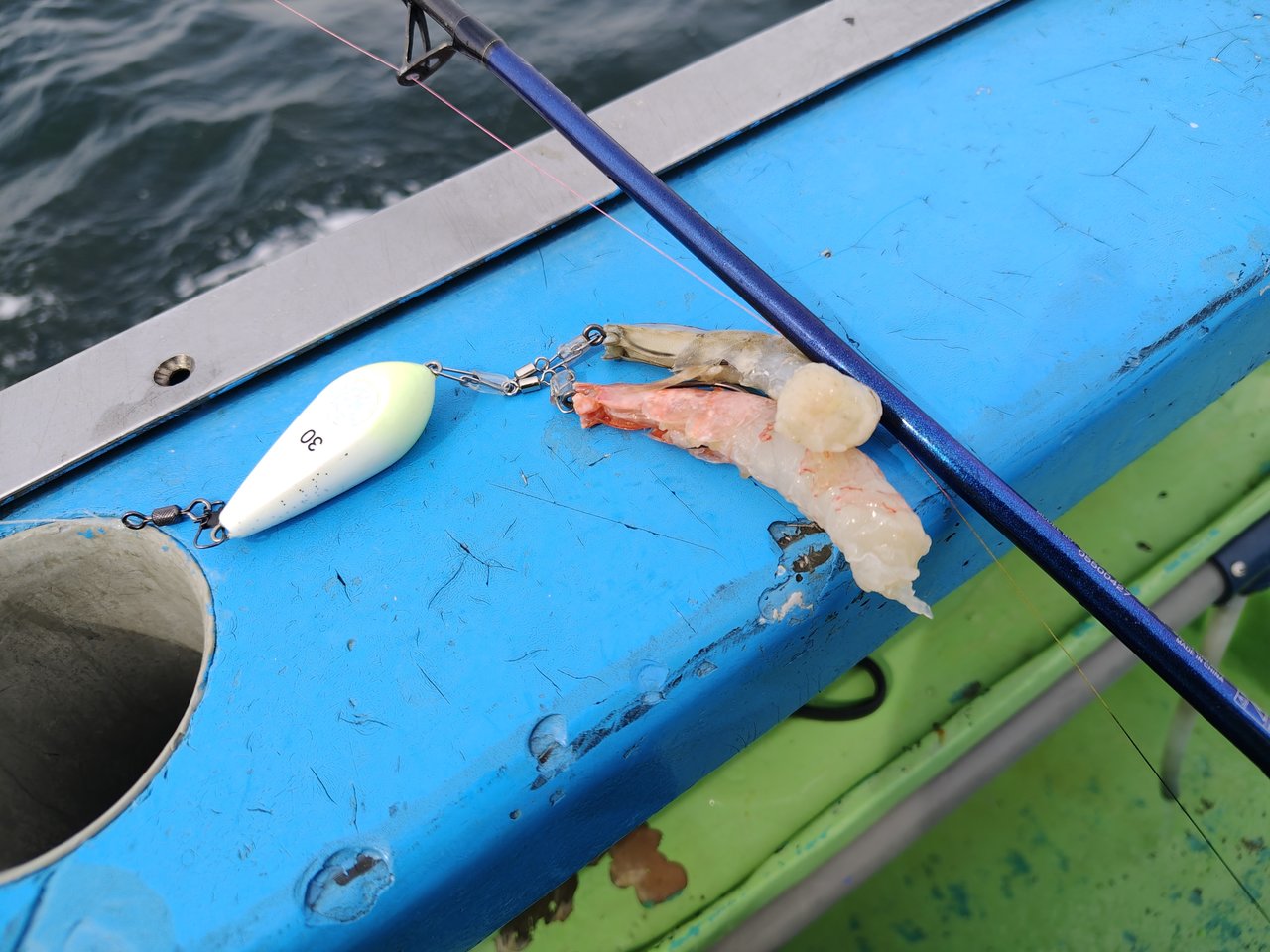 即投入しますが当たらず・・・何度か移動を繰り返して指示棚でアタリをまっていると「コツコツ」とアタリ!何度目かのアタリで合わせますが空振り・・・エサを見てみるとほとんど取られている!その後ポイントを転々として浅場のポイントに辿り着いてしばらく釣りをしていると・・・重い?気がしたので合わせてみると何かが乗った!遮二無二リールを巻いていくと・・・エビにちょっかいを出していたスミイカがカットウ針に刺さっていました(笑)