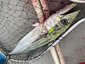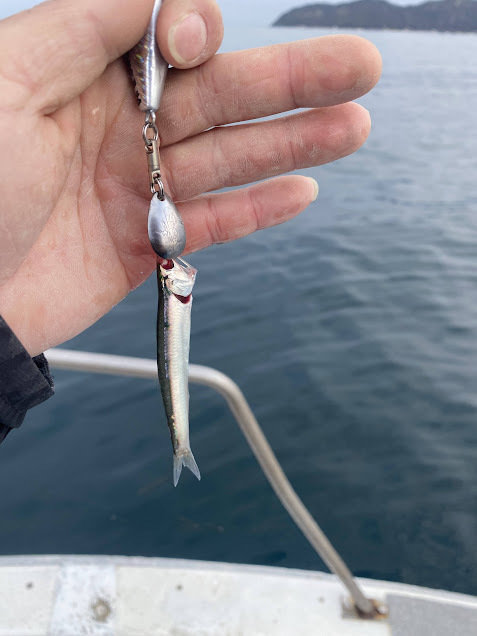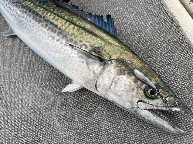 今回サワラ狙いのブレードジギングは初挑戦。朝一はオルサのファングブレード40gからスタート。船中スタッフ中西がグットサイズのサワラを幸先良くキャッチすると、続て自分にもヒット!浮いてきたのは目測メーターオーバーの良型でしたが浮いたところで痛恨のバラシ。その後は試行錯誤をしながら再度ヒットさせるもまた浮いてきたところでバラシ(泣)ジャーキングでもヒットするも歯でラインブレイク。そして昼前にやっと4度目のヒット。バレないかハラハラでしたが何とか無事キャッチ♪何とかボウズはま逃れました。ひと安心して更にジャーキングでヒットするもバラシ。おそらくロッドとフックのバランスが悪かったと思われます。今回はお試しで手持ちのタイジギングロッドを使いましたが悔しい思いをしない為にも専用タックルが必要ですね。