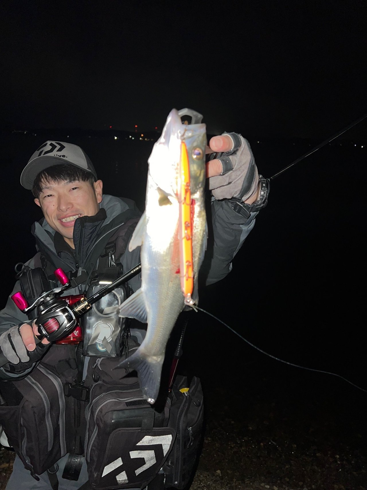 到着早々に野上テスターがダイワ【スライスリム125F】でさすがのヒット!隣ではあっちゃんがダイワ【ヒソカ150F-SSR】で連発してて、水戸店富田もピックアップ【ノガレ160F】のデッドスローで2本キャッチ!