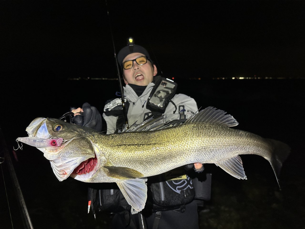 沖の狙いのポイントまで高速ハイキング(単独時の8割ほど)で向かい、地形がチョークするピンへメンバーを設置。流れが出ていないタイミングだったのでミノーをセレクト。バイトが出るスピード域を探しているとショートバイト多発。スピードを落とせば落とすほどバイトが出ないので、スピードUPしてみるとガツン!という抑え込みバイト