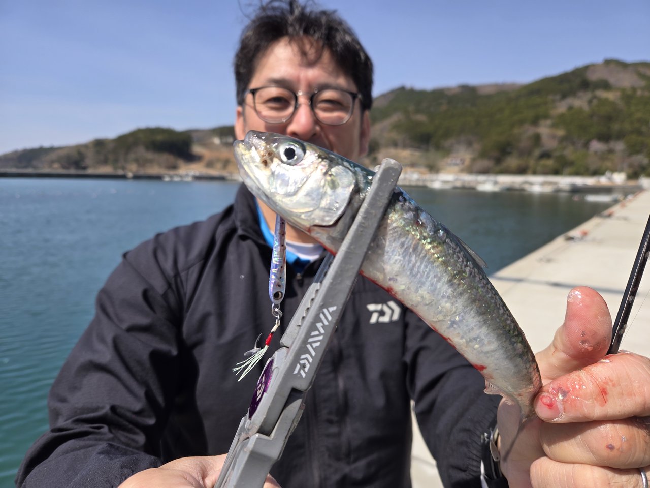 この日も漁港内にはマイワシの群れが回遊しており、時折足元を通り過ぎていく状況。早速コマセを撒いてサビキ仕掛けを投入してみましたが、コマセに寄ってくる気配がありませんでした。群れが通り過ぎるタイミングで仕掛けを投入すると釣れてくる感じで数が伸びませんでしたが、掛かってくるマイワシはほとんどが20センチ前後のの良型でした。数が釣れるように、投げサビキやメタルジグなども試してみましたが、イワシの群れがまとまっているところに投げサビキにメタルジグを付けた仕掛けを投入する事で数釣りを楽しむことが出来ました。いよいよ防波堤釣りのメインターゲットが顔を見せてくれました!!