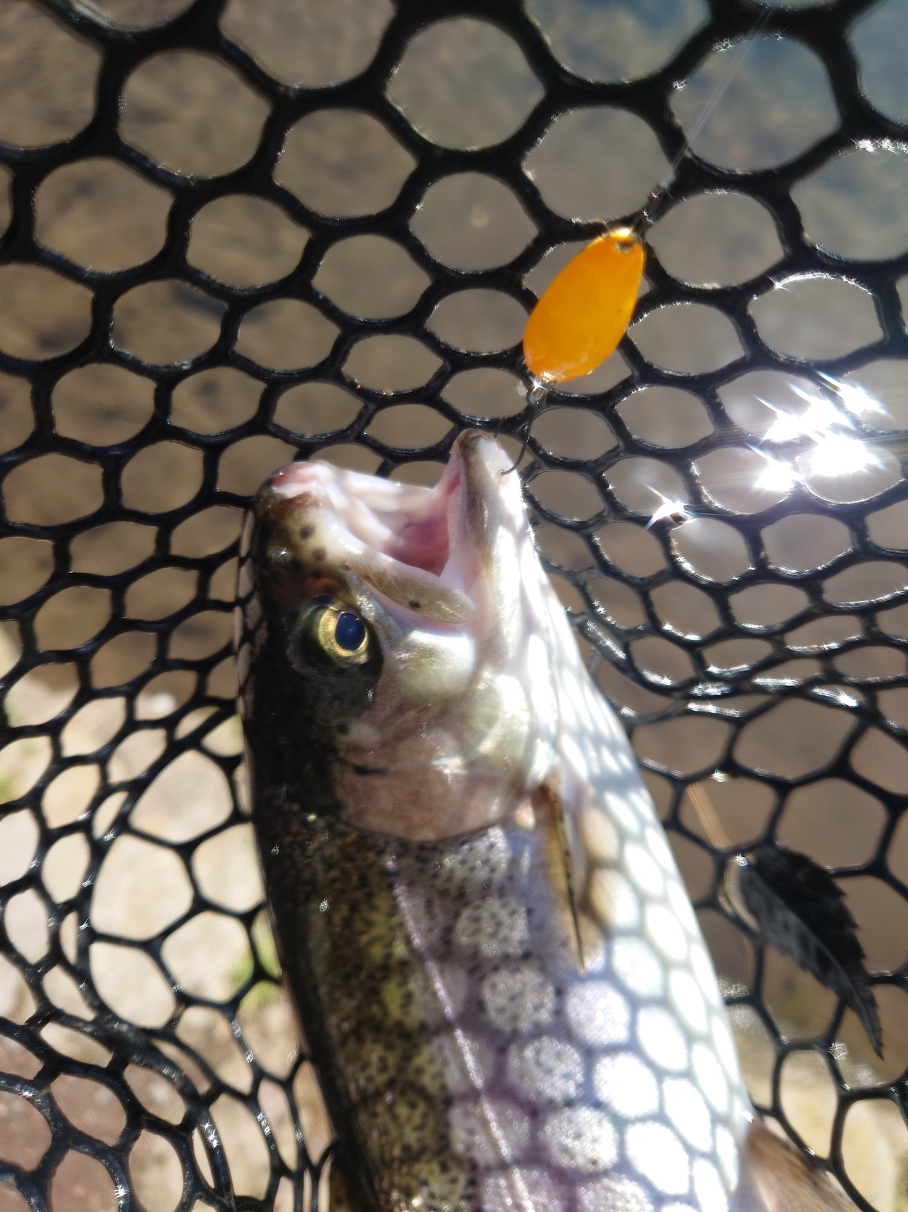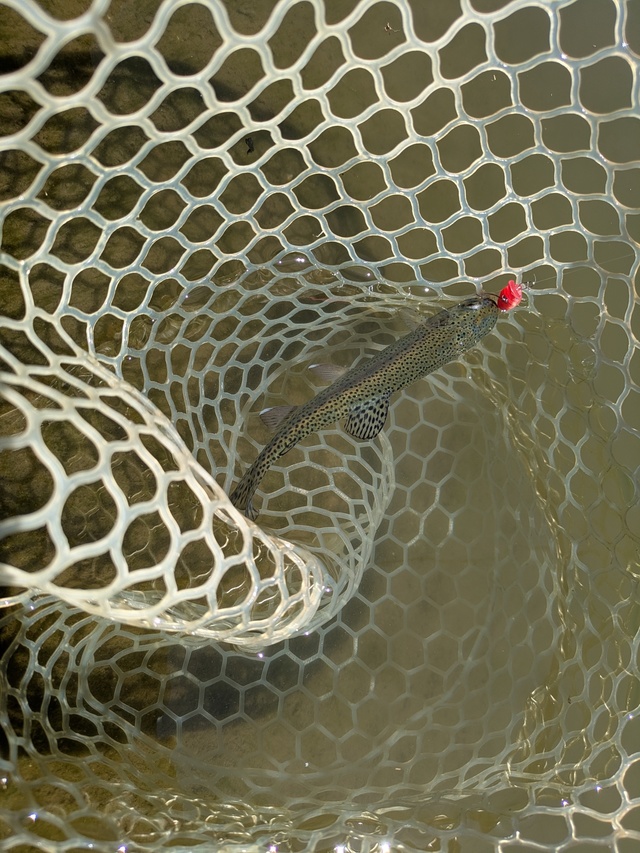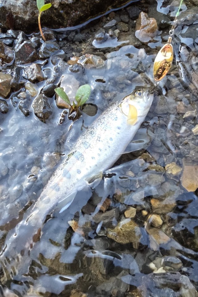 前日の夜にまとまった雨も降り、絶好の渓流日和!意気揚々と準備を済ませスタートするも、毎回掛かるポイントが無反応。その後も落ち込み中心に打ち続けるも高速バイトのみでヒットせず・・・暗雲な空気が一瞬流れましたが、流れの緩い深みに溜まってました!一ヵ所で怒涛の10連発(バラシ含む)スピナーでもミノーでも反応。特にスピナーは落ちパク状態www
