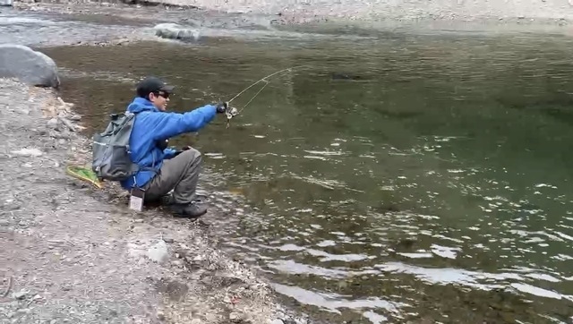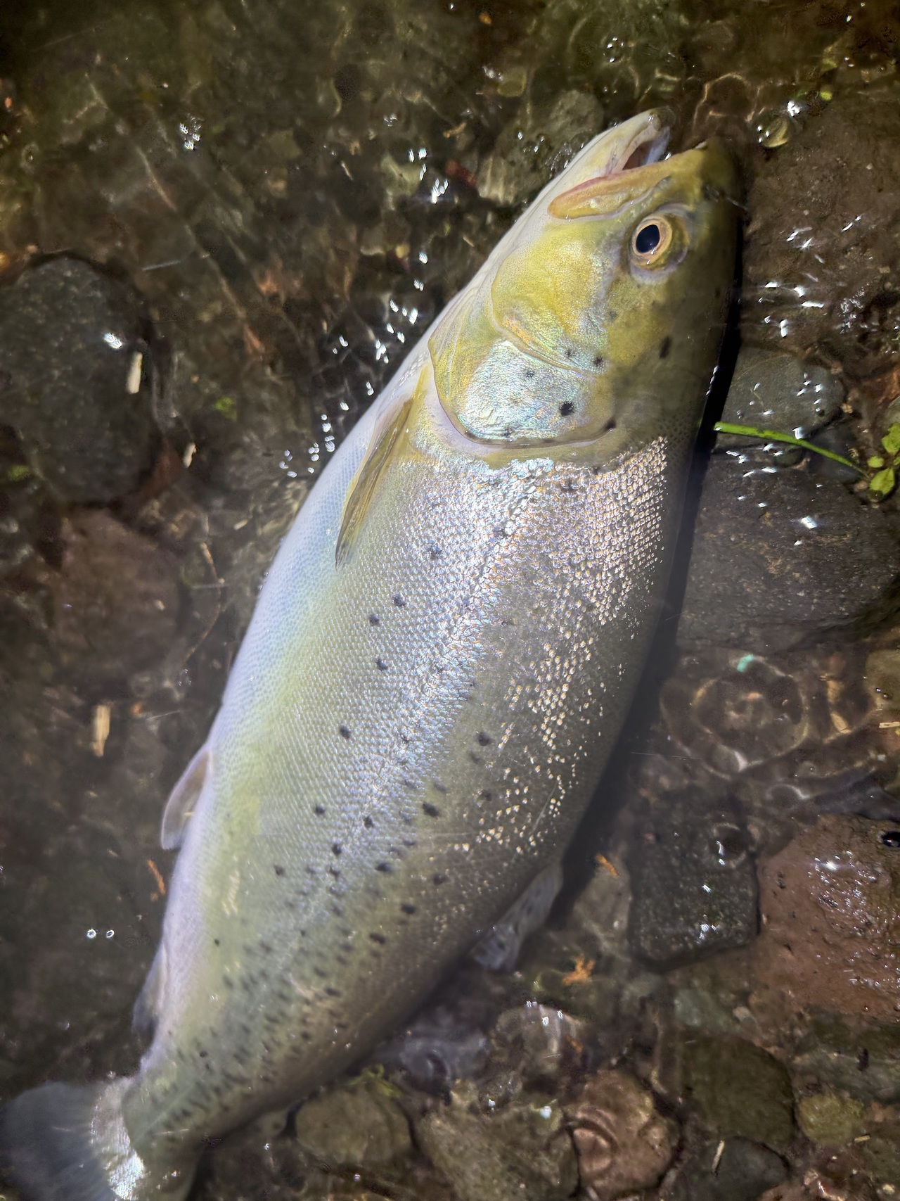 その後ポイントを移動し風が当たる面に入りミノーを投げてるとブレイク通過したあたりで強烈なヒット!