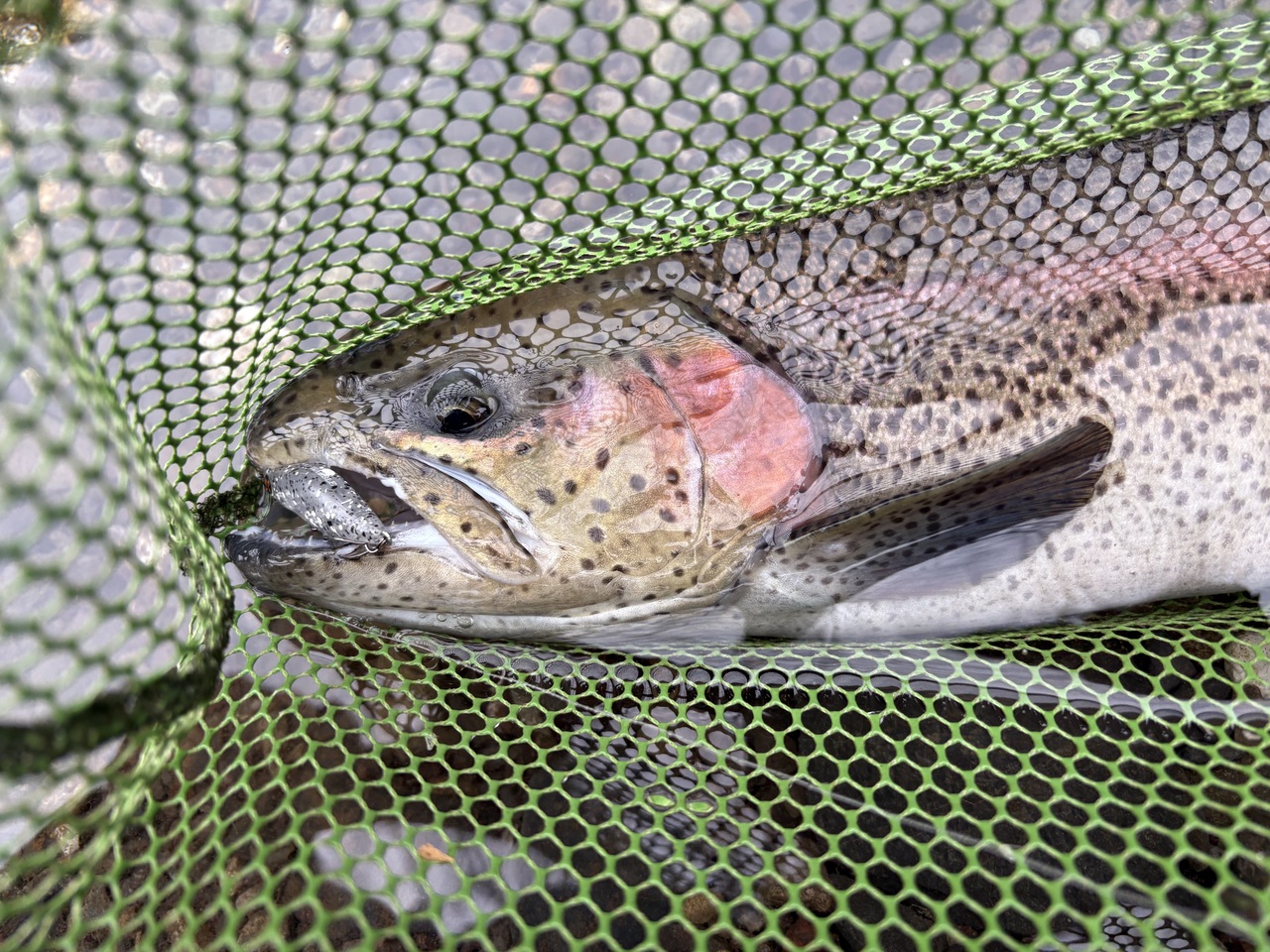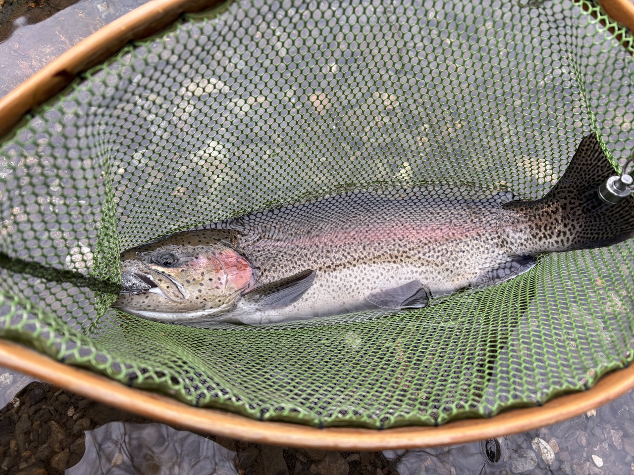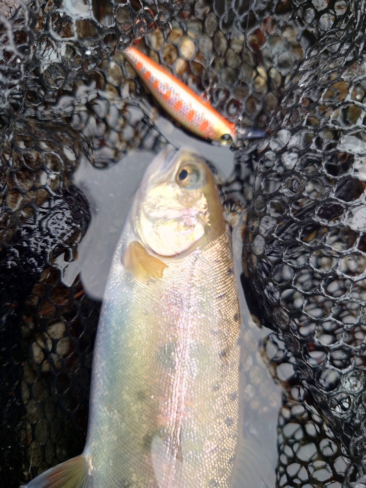 場所を移動して釣りを開始しますが、少し水深があり、流れも速いため流心の脇でのチェイスが多い。最近お気に入りの少し重めで一枚下を探れるナビア50FSを使ってみます。やはり活性が上がっているためか、雨でプレッシャーが少ないためかしっかり食ってくれます。