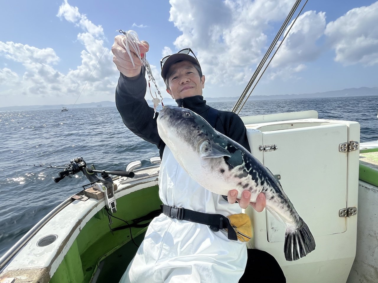 前回のリベンジを果たしロッドをぶち曲げ上がってきたのは良型のトラフグ!!