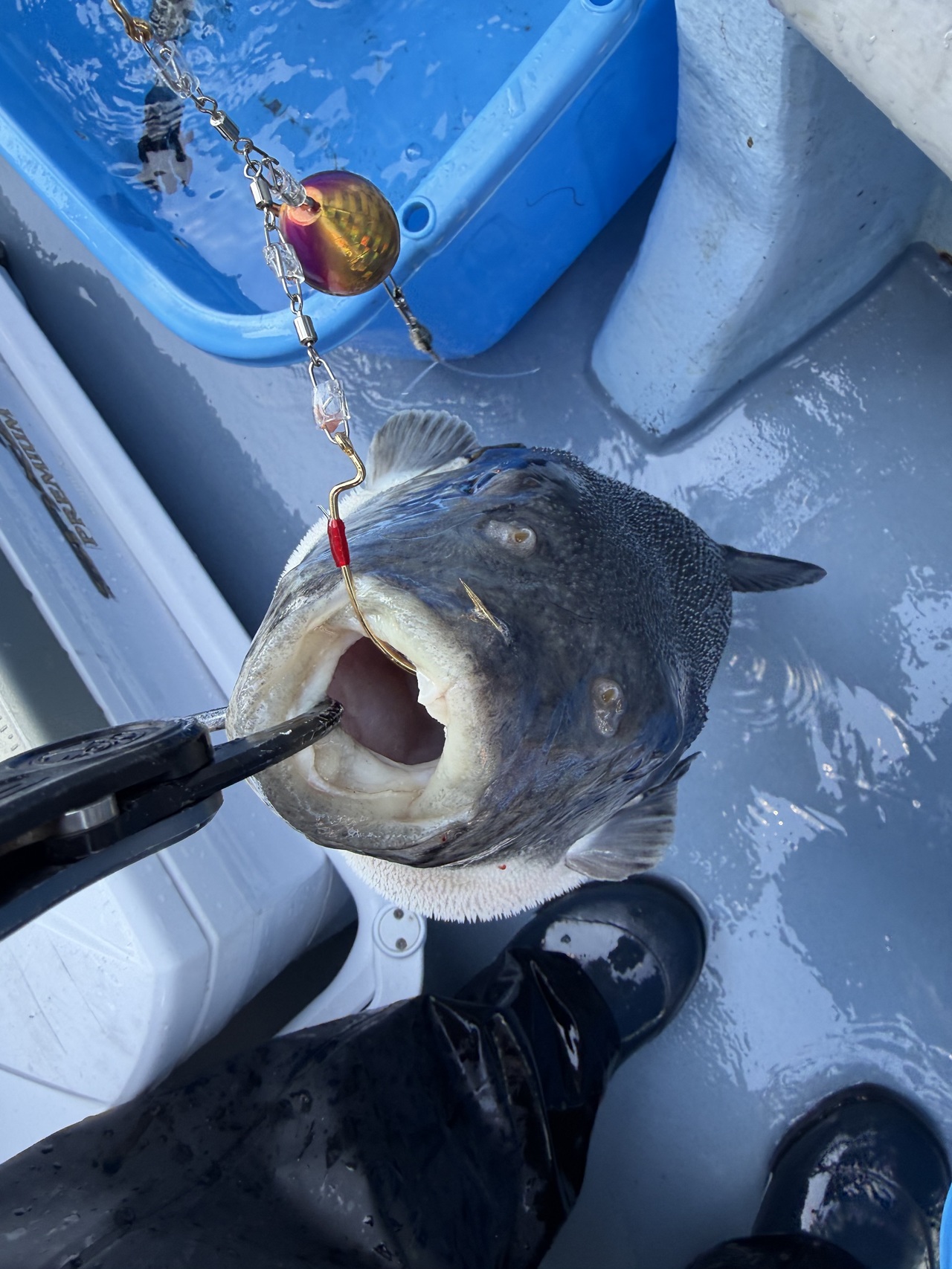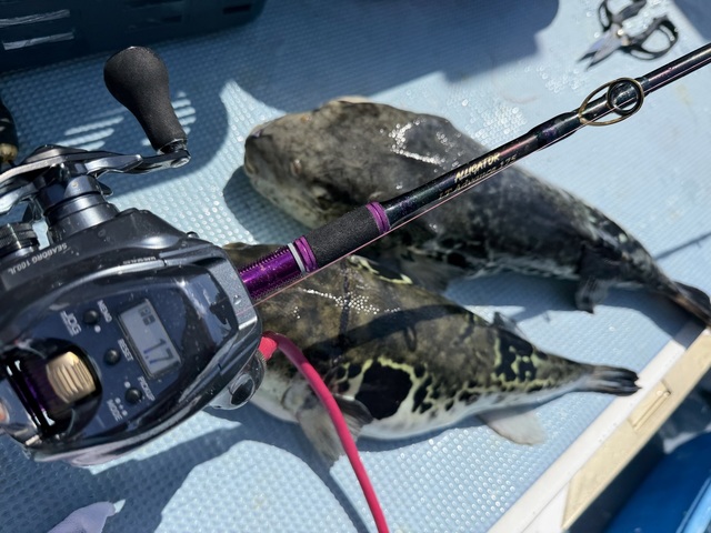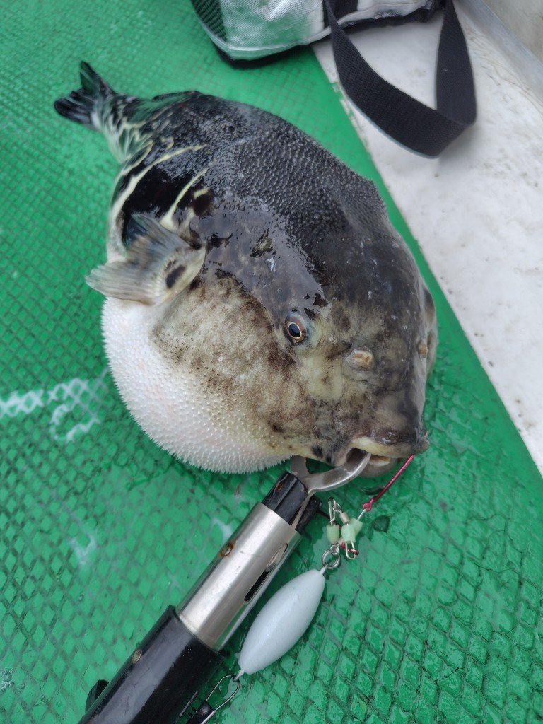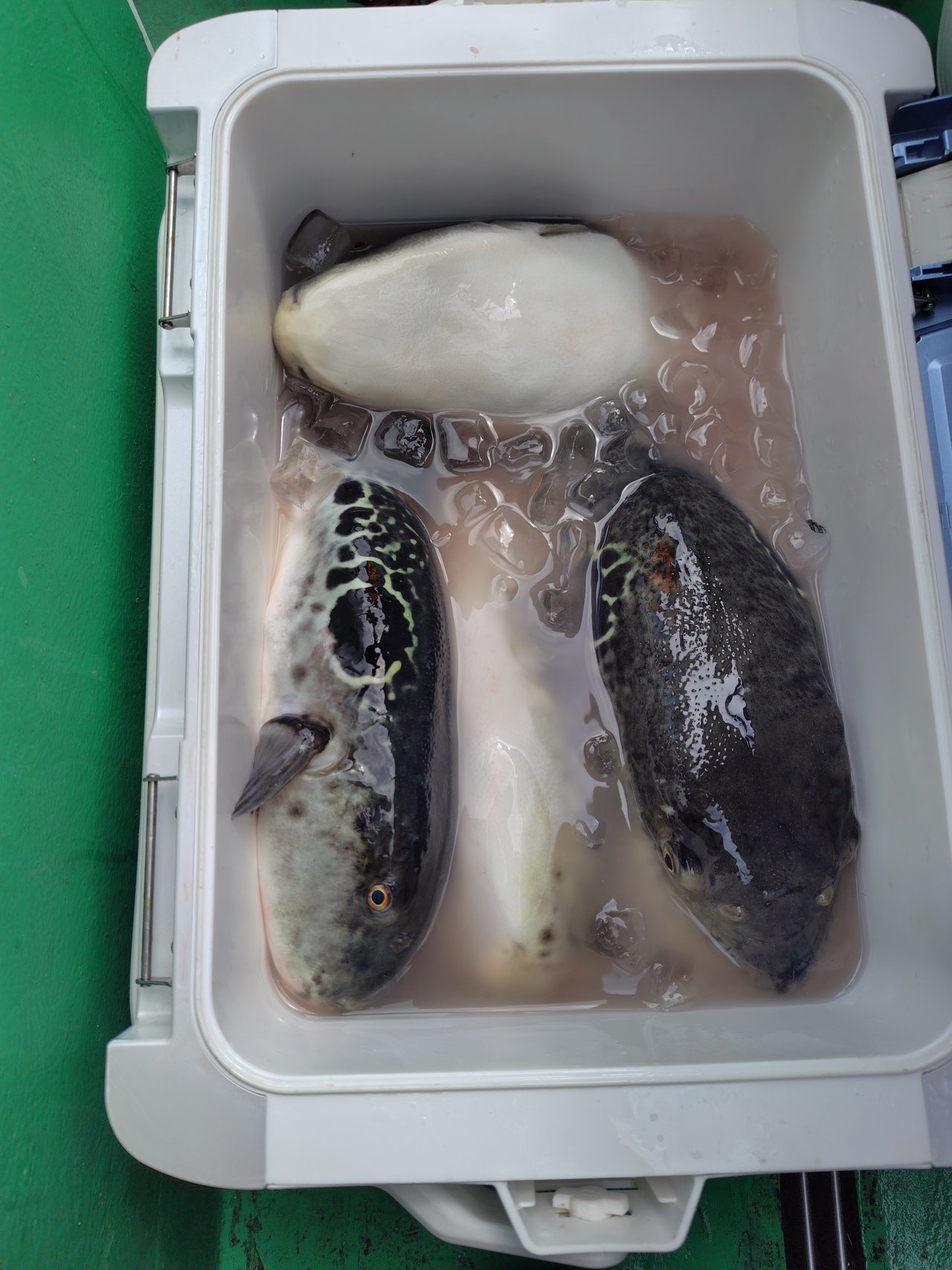 そこでは食あげの当たりがあったのでハンドルで糸ふけを取り再び鬼フッキングして3.5kgのトラフグゲットし今回は終了。