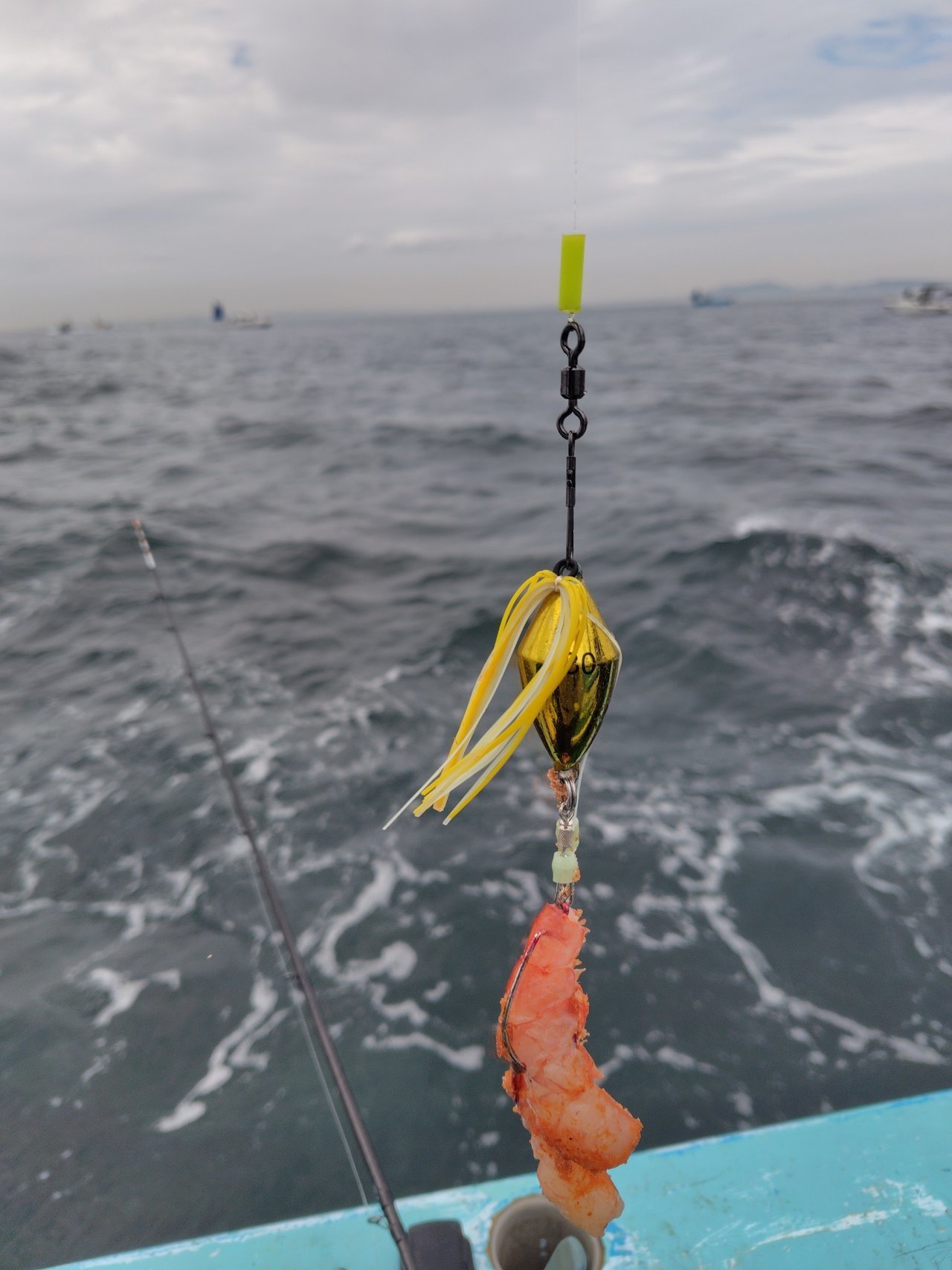 カワハギ竿に手巻きリールで1投目、着底してタナ取り直ししているとモゾモゾといきなりアタリ。