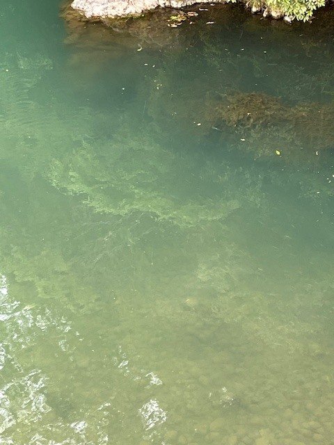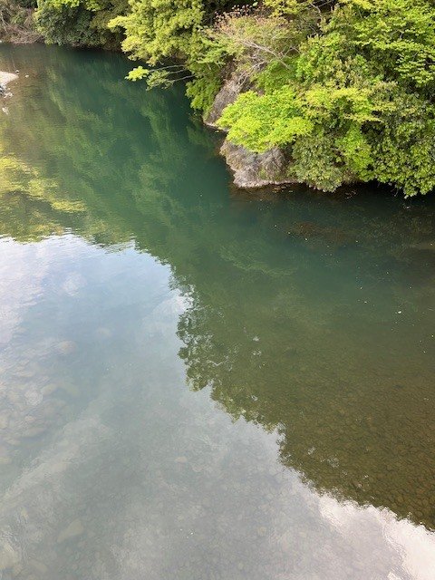 馬渡橋に着くと釣り人2名。早速、橋の上から水面を覗き込むと確かにゆったりと流れる真ん中で小魚と共にヤマメが群れています。