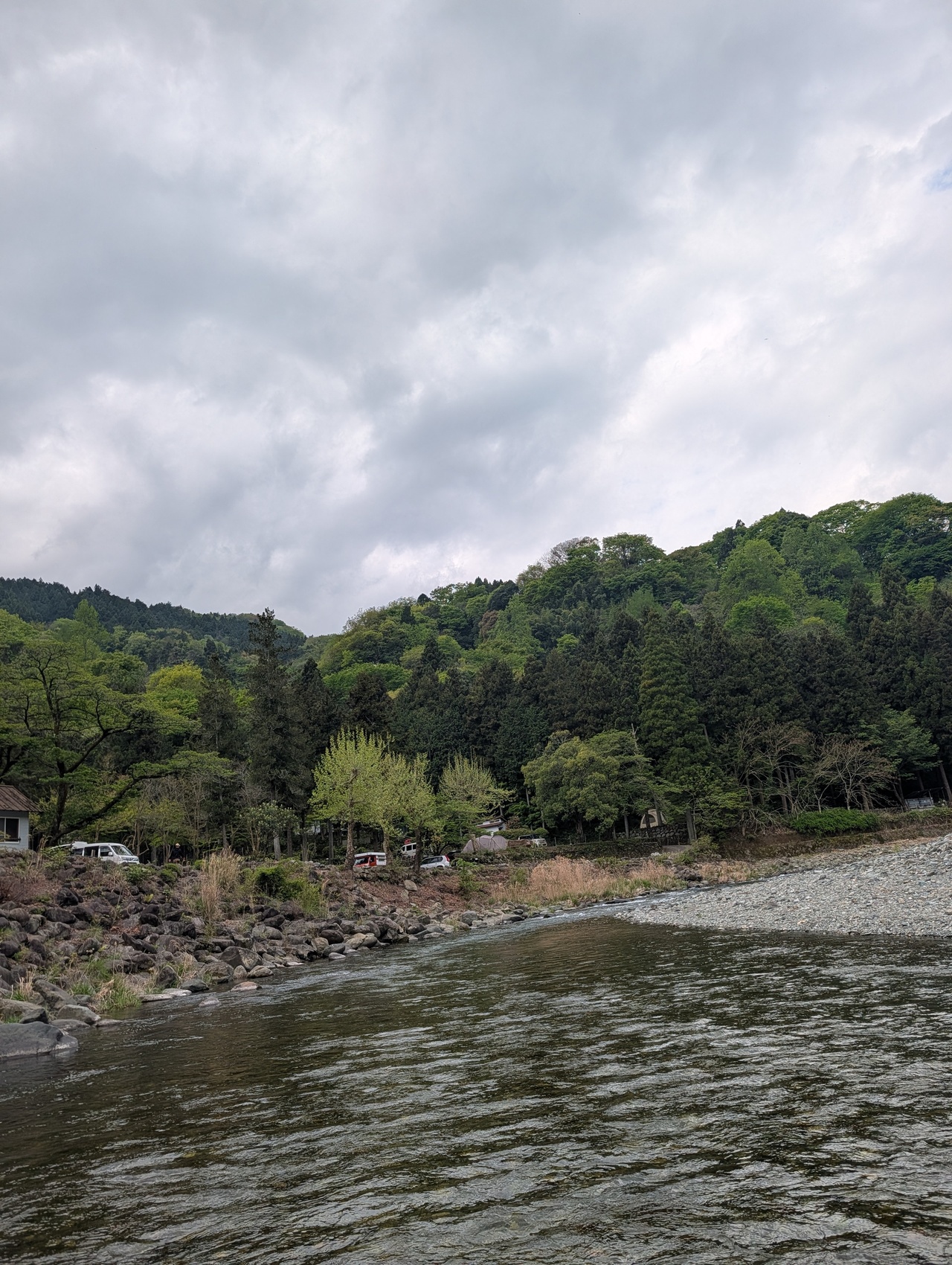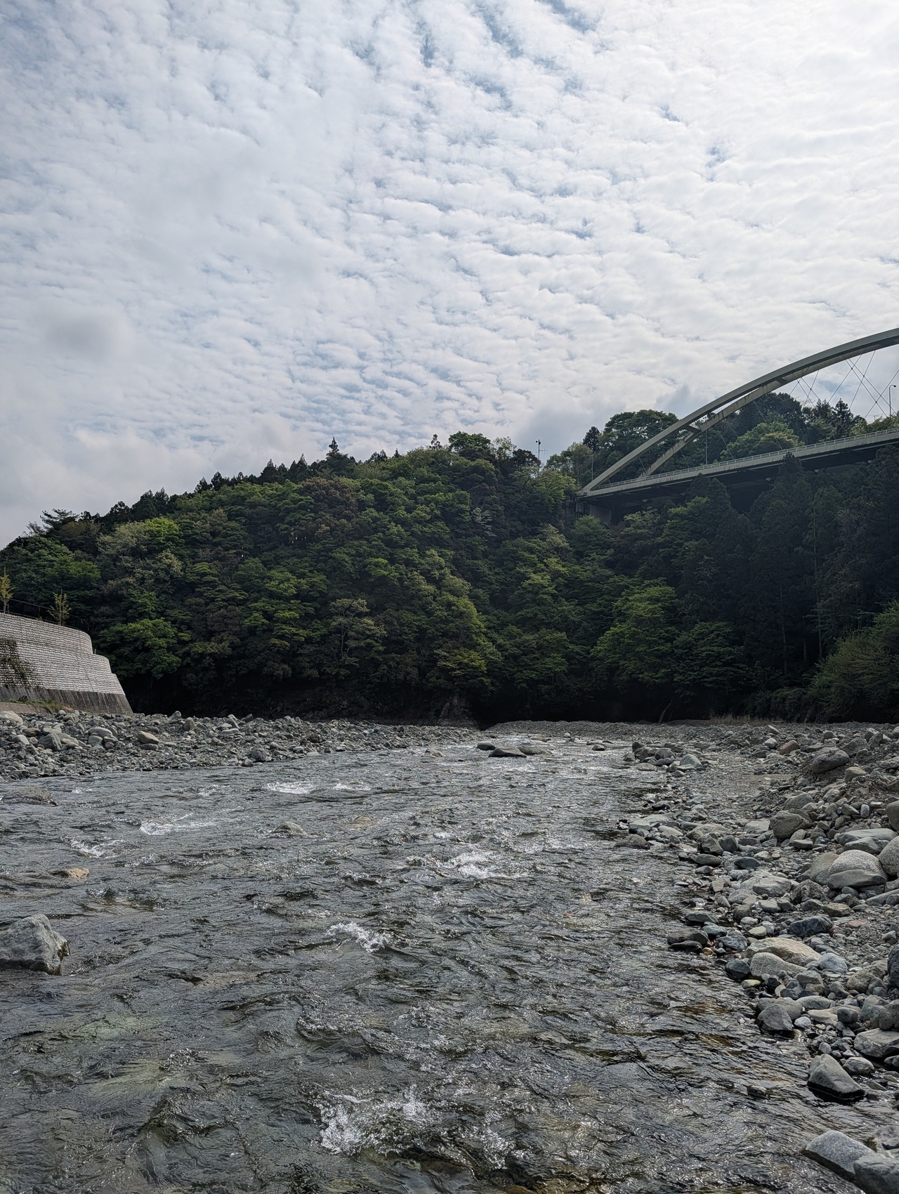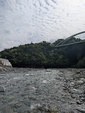 とくらや前に着くも釣り人おらず。ウェーダーは履かずにブーツで勝負。新しく整地された場所にはキャンパーが水際まで乗り込みテントを設置しているので、フライが振りづらいですがドライフライから始めましょう。するとラインを結んで水面に落とした瞬間、昨日放流されたばかりの稚鮎かハヤらしき魚がフライをツンツンしています。期待を込めてキャストをしますが当然のことのように釣れません。ソフトハックル、ニンフも流しますが1時間続けたところでルアーにチェンジ。お気に入りのブレットンを巻き続けるもチェイスは見えず。やはりブーツだと行動範囲が極端に狭くなるので仕方なし。